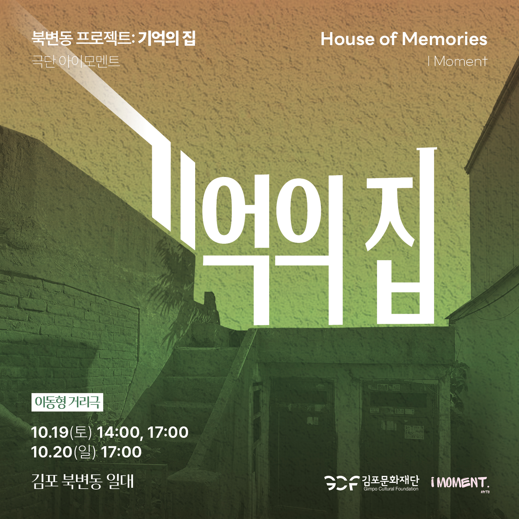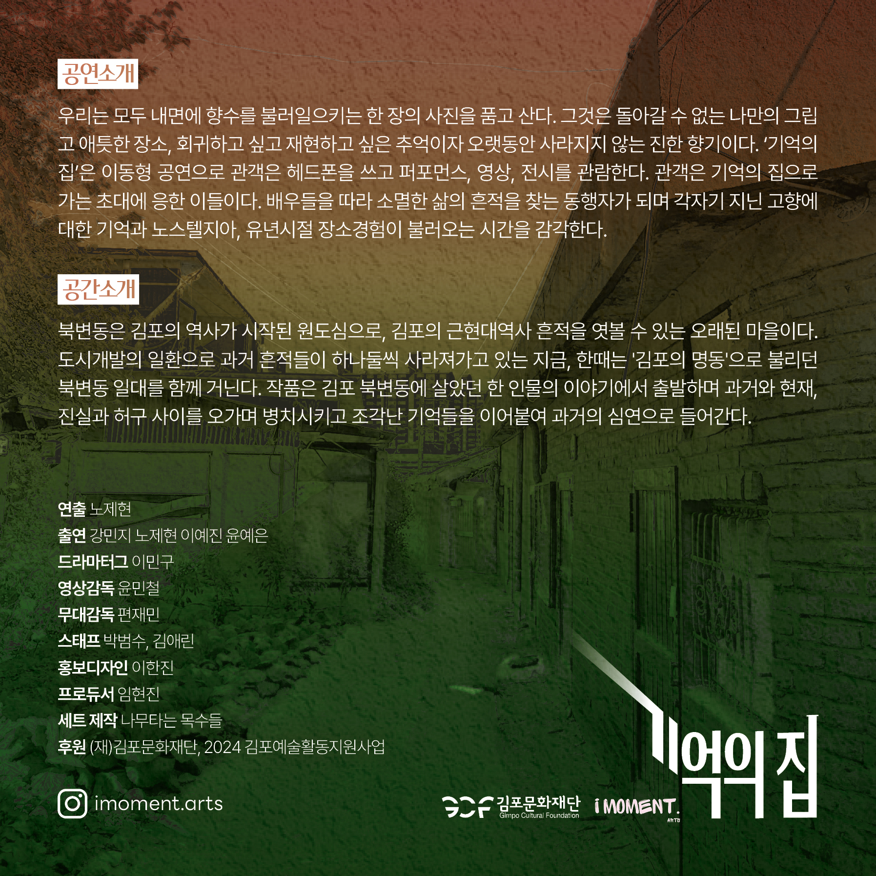 [공연소개] 우리는 내면의 향수를 불러일으키는 한 장의 사진을 품고 산다. 돌아갈 수 없는 나만의 장소, 그립고 애틋한 장소, 재현하고 싶은 추억, 오랫동안 사라지지 않는 진한 향기이다. ‘기억의 집’은 이동형 공연으로 관객은 헤드폰을 쓰고 퍼포먼스, 영상, 전시를 관람한다. 관객은 기억의 집으로 가는 초대에 응한 이들이다. 배우들을 따라 소멸한 삶의 흔적을 찾는 동행자가 되며 각자가 지닌 고향에 대한 기억과 향수, 유년시절 장소경험이 불러오는 시간을 감각한다.