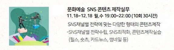 모듈별로 구성된 교육중 ''문화예술 SNS콘텐츠 제작실무'' 교육생을 모집중입니다.