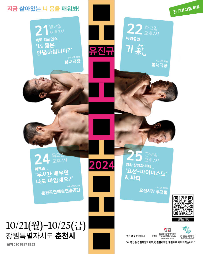 지금 살아있는 니 몸을 깨워봐! "유진규몸 2024" 참가자 모집 <유진규몸 2024>는 1989년 춘천이 마임의 도시로 나아갈 수 있도록 씨앗을 뿌린 마임 1세대이자 춘천마임축제를 만든 마이미스트 유진규가 지금 살아있는 우리들의 ‘몸’을 깨우기 위한 프로젝트 입니다. 50여 년 몸짓으로 소통하는 영원한 청년 유진규와 함께 마음으로 마임으로 소중한 '나의 몸' 을 생기 충전하는 낭만 춘천의 가을로 초대합니다!