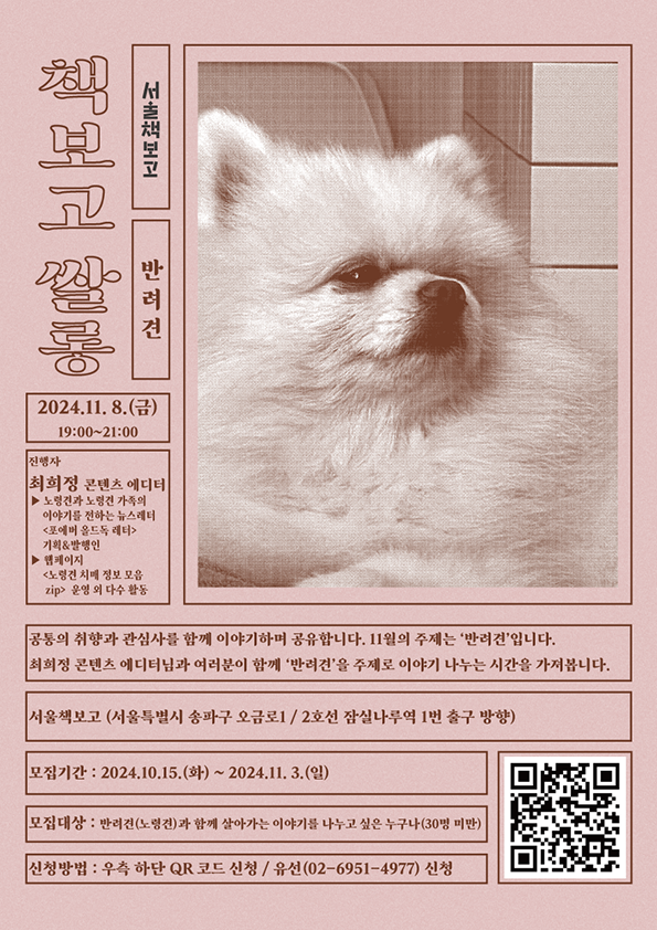 책보고 쌀롱(11월) ; 반려견 2024년 11월 올해의 마지막 <책보고 쌀롱>의 문을 엽니다. 반려견, 사진, 제로 웨이스트, 그림 등 매월 다른 주제별 진행자가 여러분과 함께 나누고 싶었던 주제와 질문들을 이야기하며, 공통의 취향과 관심사에 대한 다양한 생각을 공유하는 시간을 가져봅니다.