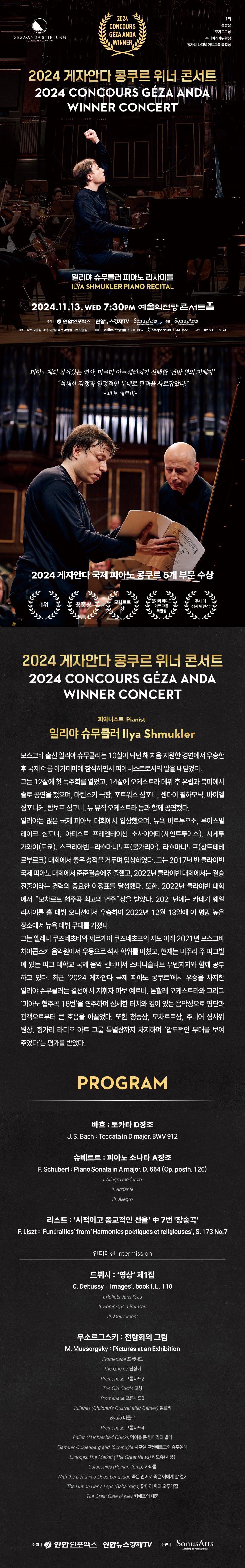 섬세하면서도 폭발적인 비르투오즘의 소유자인 일리야 슈무클러는 결선에서 지휘자 파보 예르비, 톤할레 오케스트라와 그리그 ‘피아노 협주곡 a단조 작품 16번’을 연주하며 섬세한 터치와 깊이 있는 음악성으로 평단과 관객으로부터 큰 호응을 이끌었다. 그 결과 우승을 비롯, 청중상, 모차르트상, 주니어 심사위원상, 헝가리 라디오 아트 그룹 특별상까지 차지하며 ‘압도적인 무대를 보여주었다’는 평가를 받았다. 클래식계의 살아있는 전설, 피아니스트 마르타 아르헤리치와 지휘자 파보 예르비가 선택한 일리야 슈무클러의 연주는 두 대가들의 극찬을 받으며 관객들에게 깊은 감동을 선사했다. '2024 게자안다 국제 피아노 콩쿠르'의 뜨거웠던 열기는 오는 11월 13일(수) 예술의전당 콘서트홀에서 재현될 예정이다.