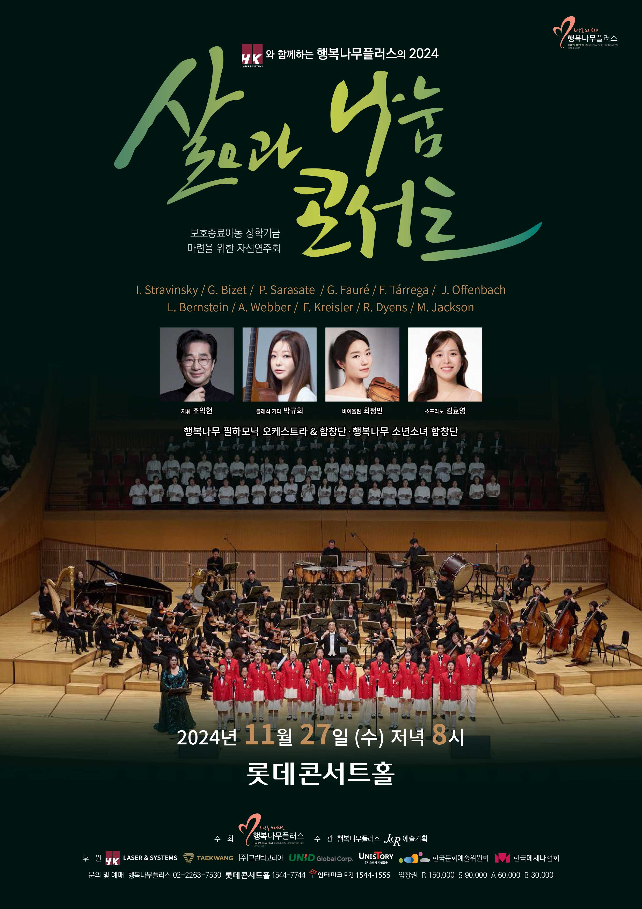(사)행복나무플러스는 아동보호시설에 거주하고 있는 아동들과 시설출신 대학생들을 위해 장학금 마련을 위한 자선 연주회를 매년 진행하는 예술법인이며 비영리사단법인입니다. 그동안 예술의 전당, 세종문화회관, 롯데콘서트홀 등에서 개최한 자선공연을 통하여 만들어진 기금으로 많은 대학생들에게 장학금을 지원하였습니다. 2024년에는 84명의 대학생들에게 총 1억 3천만 원의 장학금을 지급하였습니다. 조익현 지휘자가 이끄는 행복나무 필하모닉 오케스트라 & 합창단, 그리고 국내 최고의 협연자들이 함께 만들어 내는 감동적인 음악회에 오셔서 행복한 시간을 보내시길 바랍니다.