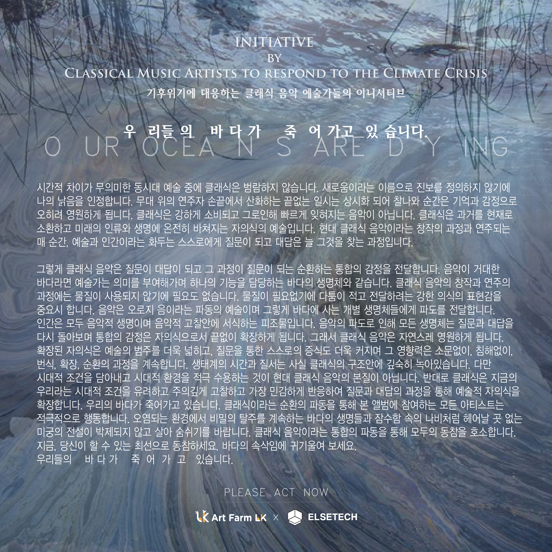 음악은 오로지 음이라는 파동의 예술이며 그렇게 바다에 사는 개별 생명체들에게 파도를 전달합니다. 인간은 모두 음악적 생명이며 음악적 고찰안에 서식하는 피조물입니다. 음악의 파도로 인해 모든 생명체는 질문과 대답을 다시 돌아보며 통합의 감정은 자의식으로서 끝없이 확장하게 됩니다. 그래서 클래식 음악은 자연스레 영원하게 됩니다. 확장된 자의식은 예술의 범주를 더욱 넓히고, 질문을 통한 스스로의 증식도 더욱 커지며 그 영향력은 소문없이, 침해없이, 번식, 확장, 순환의 과정을 계속합니다. 생태계의 시간과 질서는 사실 클래식의 구조안에 깊숙히 녹아있습니다. 다만 시대적 조건을 담아내고 시대적 환경을 적극 수용하는 것이 현대 클래식 음악의 본질이 아닙니다. 반대로 클래식은 지금의 우리라는 시대적 조건을 유려하고 주의깊게 고찰하고 가장 민감하게 반응하여 질문과 대답의 과정을 통해 예술적 자의식을 확장합니다. 우리의 바다가 죽어가고 있습니다. 클래식이라는 순환의 파동을 통해 본 앨범에 참여하는 모든 아티스트는 적극적으로 행동합니다. 오염되는 환경에서 비밀의 탈주를 계속하는 바다의 생명들과 잠수함 속의 나비처럼 헤어날 곳 없는 미궁의 전설이 박제되지 않고 살아 숨쉬기를 바랍니다. 클래식 음악이라는 통합의 파동을 통해 모두의 동참을 호소합니다. 지금, 당신이 할 수 있는 최선으로 동참하세요. 바다의 속삭임에 귀기울여 보세요.