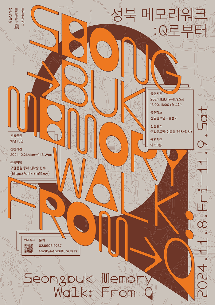 <성북 메모리워크: Q로부터>는 다양한 주택의 역사자원이 남아있는 정릉에 살았던 문화예술인의 삶과 그들의 예술, 정릉의 도시주〮택발전사를 재해석한 장소특정형 공연입니다. 그들의 숨결이 남아있는 거리를 따라 걸으며 공연을 감상하는 형식으로 진행되며 산일경로당에서 출발해 솔샘교에서 마무리됩니다. 공연을 통해 문화예술인의 사라진 공간을 상상하고 정릉의 변천사와 예술인의 작품세계를 느껴보시길 바랍니다.