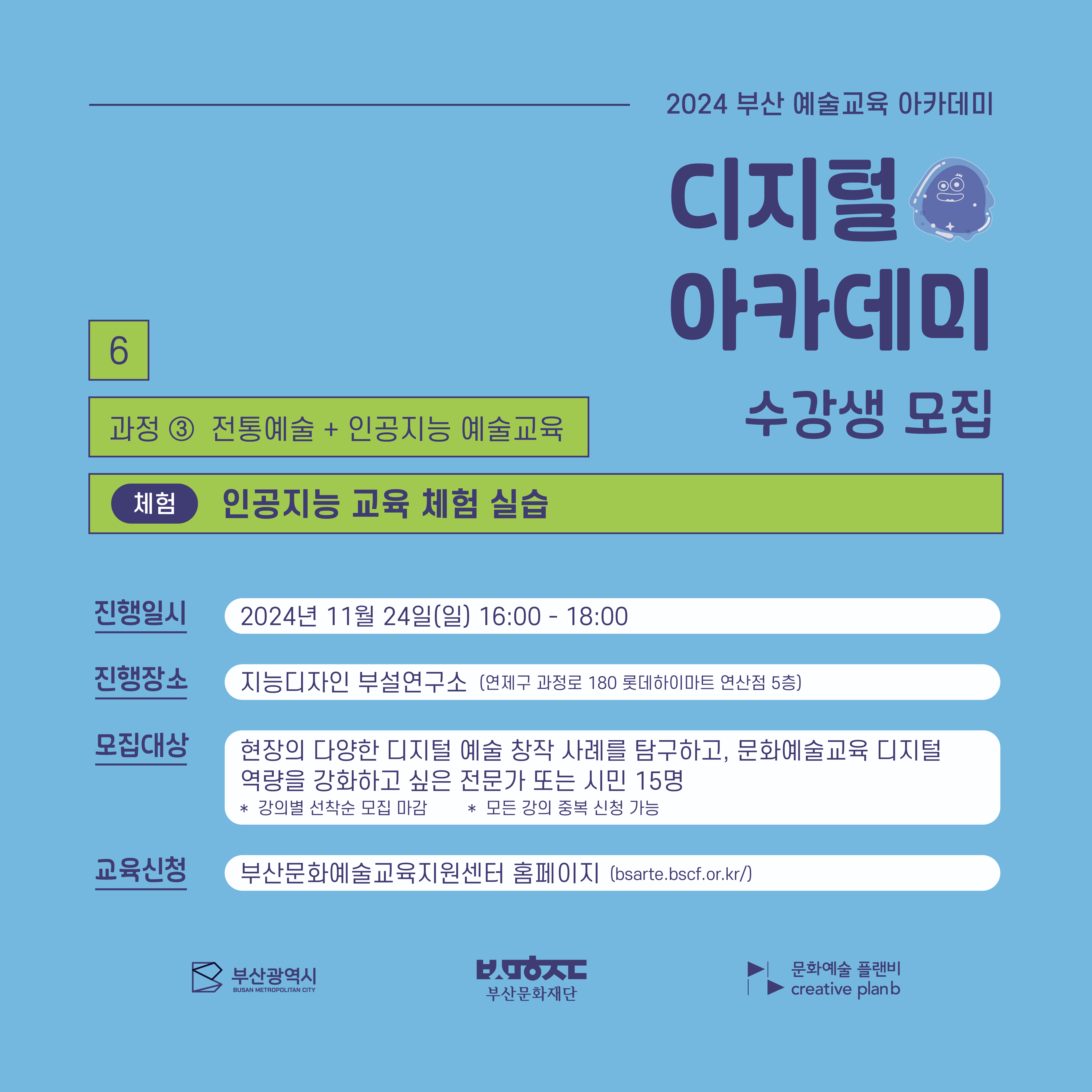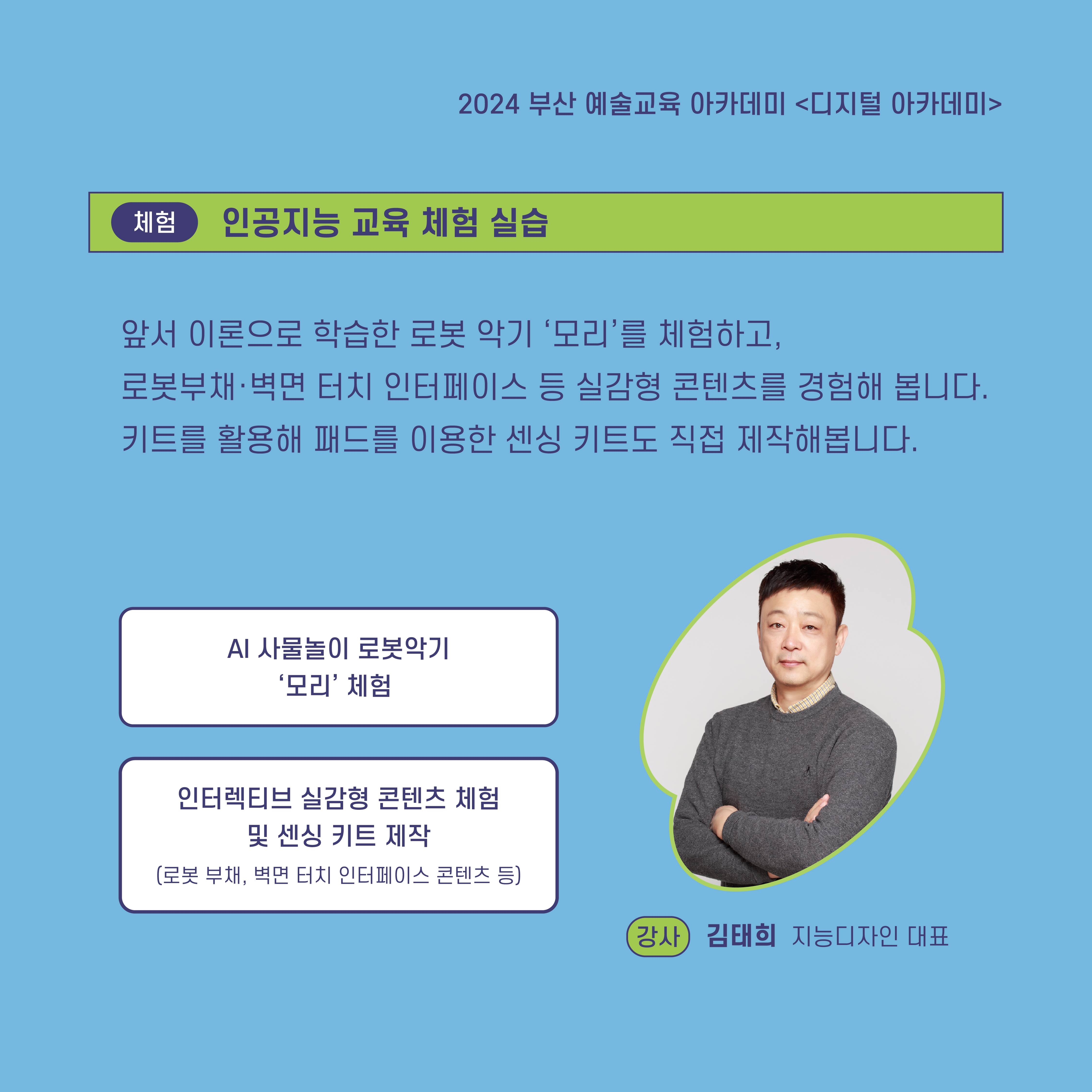 2024 부산예술교육 아카데미는 문화예술교육 활동가로서의 통합적 역량을 강화하고, 새로운 지역형 문화예술교육 프로그램을 발굴, 확산하기 위한 예술교육 프로그램입니다. <디지털 아카데미>는 문화예술교육 관련 전문가 또는 이에 관심 있는 시민들을 대상으로 하는 교육 프로그램으로, 11월 22일(금)에서 24일(일)까지 3일간 6개의 프로그램이 진행됩니다. 여섯 번째 디지털 아카데미인 <과정3. 전통예술+인공지능 예술교육 : 인공지능 교육 체험 실습>은 로봇 악기 ‘모리’와 실감형 콘텐츠를 체험해보고, 키트를 활용한 센싱 키트를 직접 제작해보는 예술교육 프로그램입니다. ✔일시: 2024. 11. 24.(일) 16:00 ~ 18:00 ✔장소: 지능디자인 부설연구소(연제구 과정로 180 롯데하이마트 연산점 5층) ✔대상: 현장의 다양한 디지털 예술 창작 사례를 탐구하고, 문화예술교육 역량을 강화하고 싶은 전문가 또는 시민 15명 ✔신청: 부산문화예술교육지원센터 홈페이지(bsarte.bscf..kr) ✔비용: 무료 ✔문의: 문화예술 플랜비 051-622-6200 *신청확인 및 교육안내 등은 11/21(목)에 문자로 일괄 안내 예정입니다.