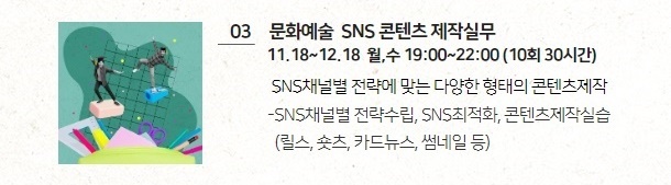 SNS채널별 전략에 맞는 다양한 형태의 콘텐츠를 제작해 보고 채널별 전략수립, 최적화 등을 공부할 수 있는 교육입니다!