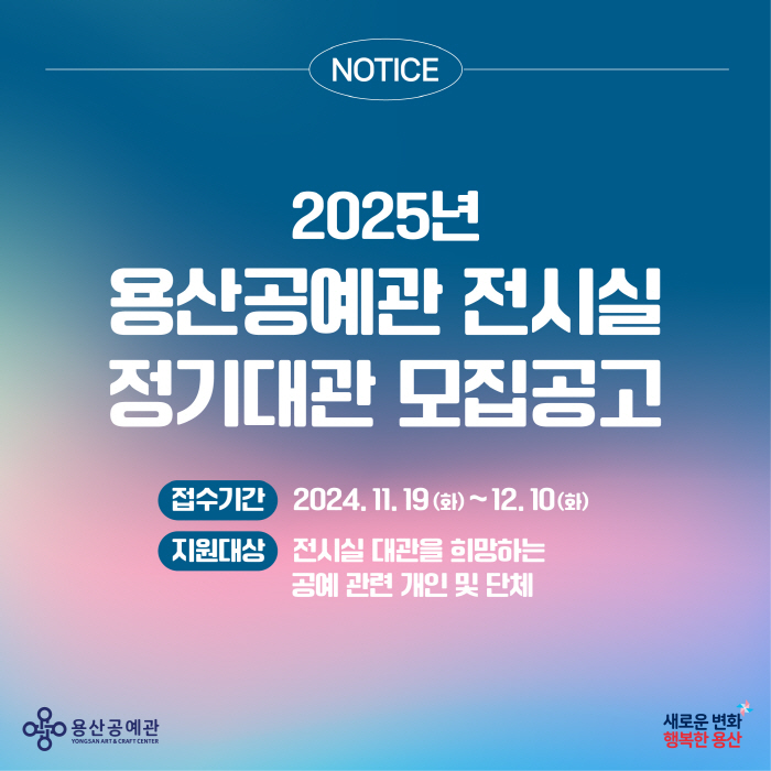 2025년 용산공예관 4층 전시실 대관 공고 용산공예관에서는 공예 작가들의 전시 활동을 지원하고자『용산공예관 4층 전시실 대관』을 아래와 같이 공고합니다. 1. 대관 지원 대상 ○ 현재 공예창작활동을 하고 있으며, 용산공예관 4층 전시실 대관을 희망하는 공예 관련 개인 또는 단체