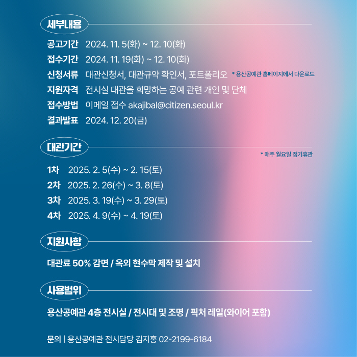 6. 기타 유의사항 ○ 대관신청서, 대관 규약의 확인서는 공고문에 첨부된 양식으로 작성 부탁드립니다. ○ 제출한 서류는 반환하지 않으며, 기재사항을 수정할 수 없습니다. ○ 기재사항 착오 및 누락, 허위기재 등으로 발생한 불이익에 대한 책임은 신청자에게 있습니다. ○ 기타 상세한 내용은 아래 연락처로 문의하시기 바랍니다. - 용산공예관 교육전시팀 전시담당 김지홍(☎ 02-2199-6184)