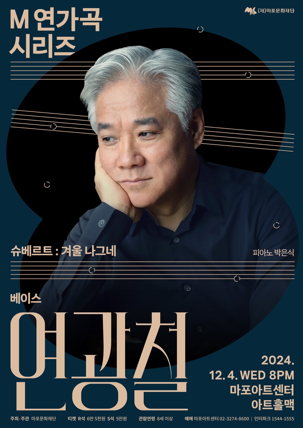 ✔️ 공연명 : M연가곡 시리즈 - 베이스 연광철 ✔️ 일시 : 2024. 12. 4.(수) 20:00 ✔️ 장소 : 마포아트센터 아트홀맥 ✔️ 티켓 : R석 65,000원 S석 50,000원 ✔️ 할인 : 학생할인 40, 마포구민 30 등 ✔️ 예매/문의 : 02-3274-8600 (문의 1번) / 평일 9시-18시 (토, 일, 공휴일 휴무) ✔️ 자세히보기 ▶ https://rb.gy/hd87ml