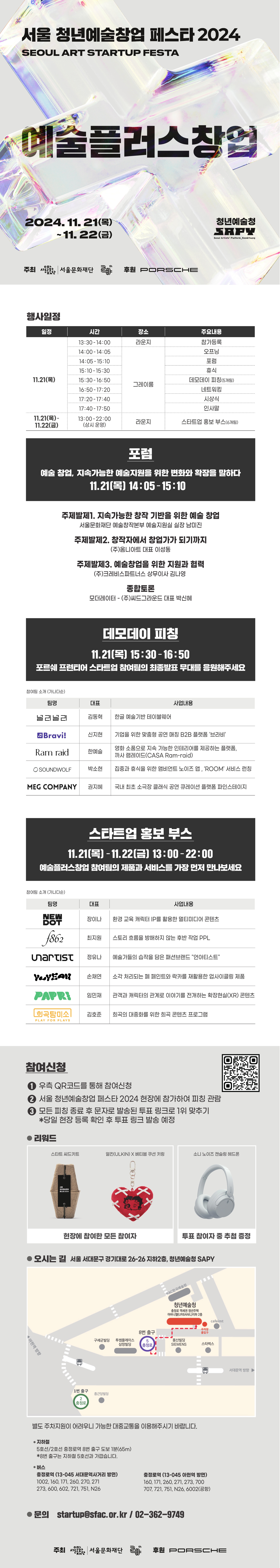 서울문화재단 예술 창업지원 사업에 참여한 스타트업의 성과를 선보이는 자리에 여러분을 초대합니다. 예술 창업기업의 피칭발표와 창업 포럼, 기업 홍보부스 등 다채로운 프로그램으로 준비되어 있으니 관심있는 분들의 많은 참여바랍니다. ■장소: 청년예술청 그레이룸(서대문구 경기대로 26-26, 지하2층) ■일정: 11월 21일(목) 오후 2시~오후 6시