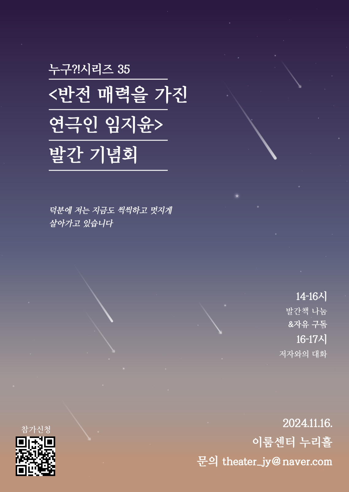 임지윤씨가 대표로 있는 극단 제이와이는 그의 자서전인 <반전 매력을 가진 연극인 임지윤> 발간기념회를 오는 16일 오후 4시에 이룸센터 누리홀에서 개최한다고 했다.