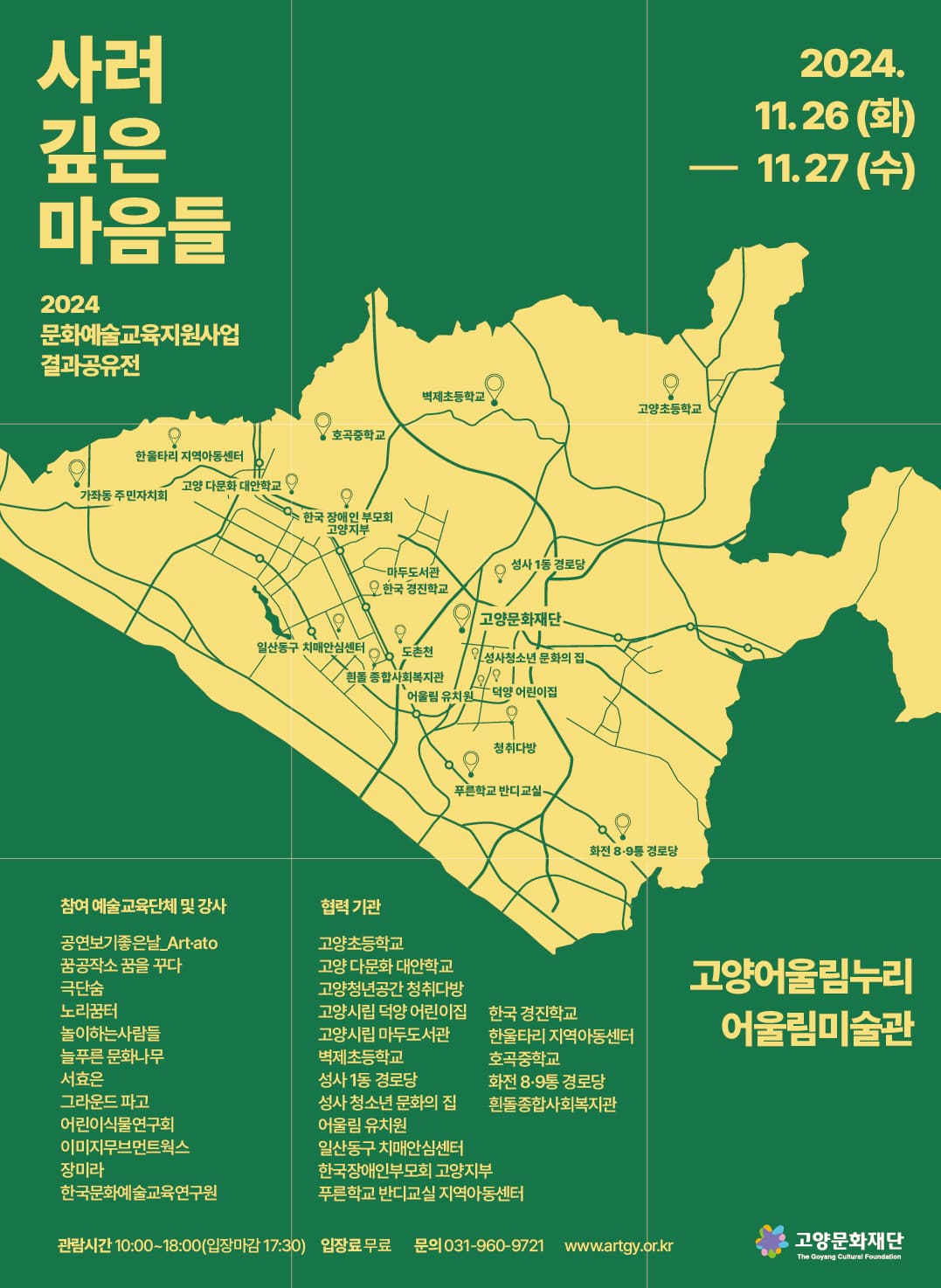 💚 전 시 명 : <2024 사려 깊은 마음들> 결과공유展 💚 전시기간 : 2024. 11. 26.(화) ~ 2024. 11. 27.(수) 10시~18시 (17시30분 입장마감) 💚 전시장소 : 고양어울림누리 어울림미술관(덕양구 어울림로33) 💚 전시내용 : - 2024 고양시 총 17곳에서 펼쳐진 문화예술교육 활동과정과 결과 기록 - 고양 예술교육가 양성 및 역량강화 프로그램 결과 공유 - 기관 대상 고양 문화예술교육 소개 및 프로그램 상담 부스 운영
