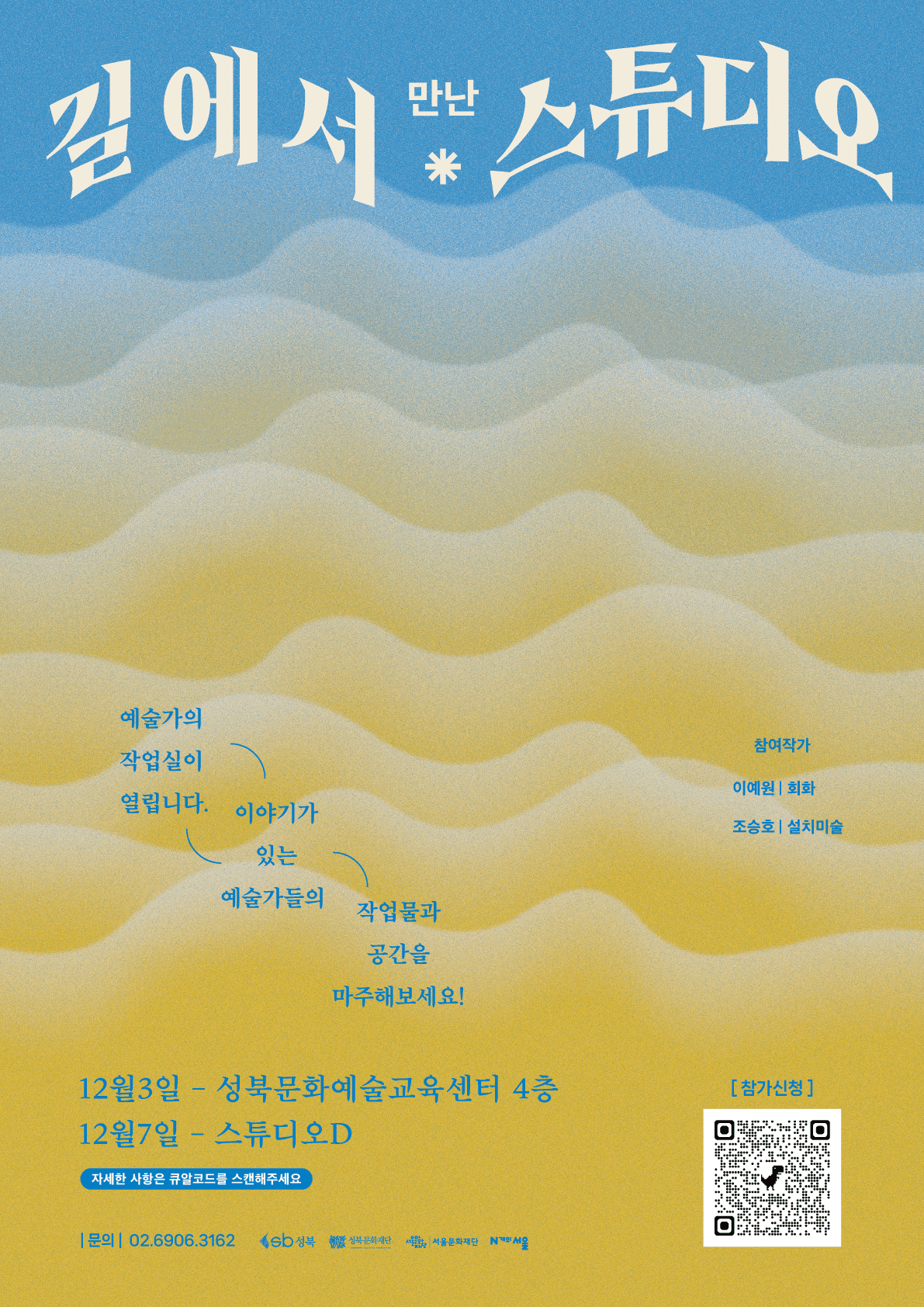 - 명칭 : 길에서 만난 스튜디오 - 일시 : 12월 3일(화), 12월 7일(토) - 장소 : 3일(화) 성북문화예술교육센터 4층 / 7일(토) 스튜디오D