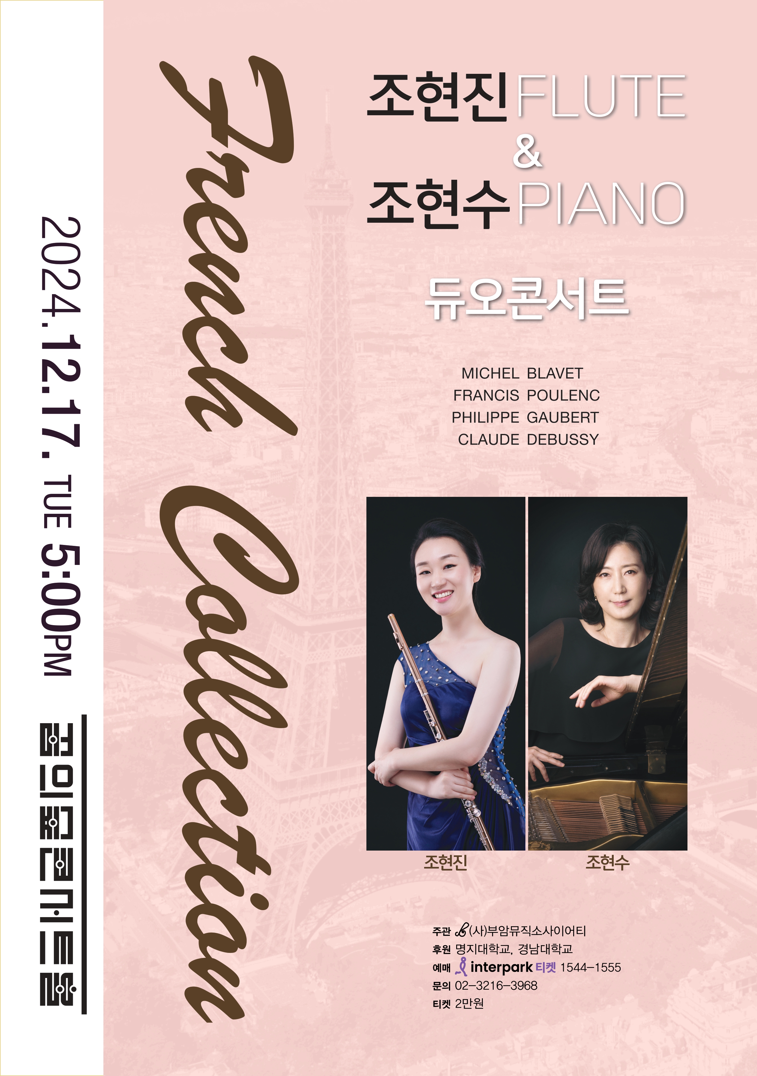조 현 진 / Flute *국민대학교 관현악과 졸업 *미국 Mannes College of Music The New School 석사 *미국 University of Minnesota 박사 *미국 Flute Society of Washington, Young Artist Competition 3위 *현재 경남대학교 강의전담교수 조 현 수 / Piano *서울 예고, 서울대 음대 졸업 *미국 Temple University 석사 *미국 University of Minnesota 박사 *미국 Schubert Club Metropolitan Artist 오디션 우승 *KBS 한국의 연주가 시리즈 음반 제작 *현재 명지대학교 예술학부 피아노 전공 교수