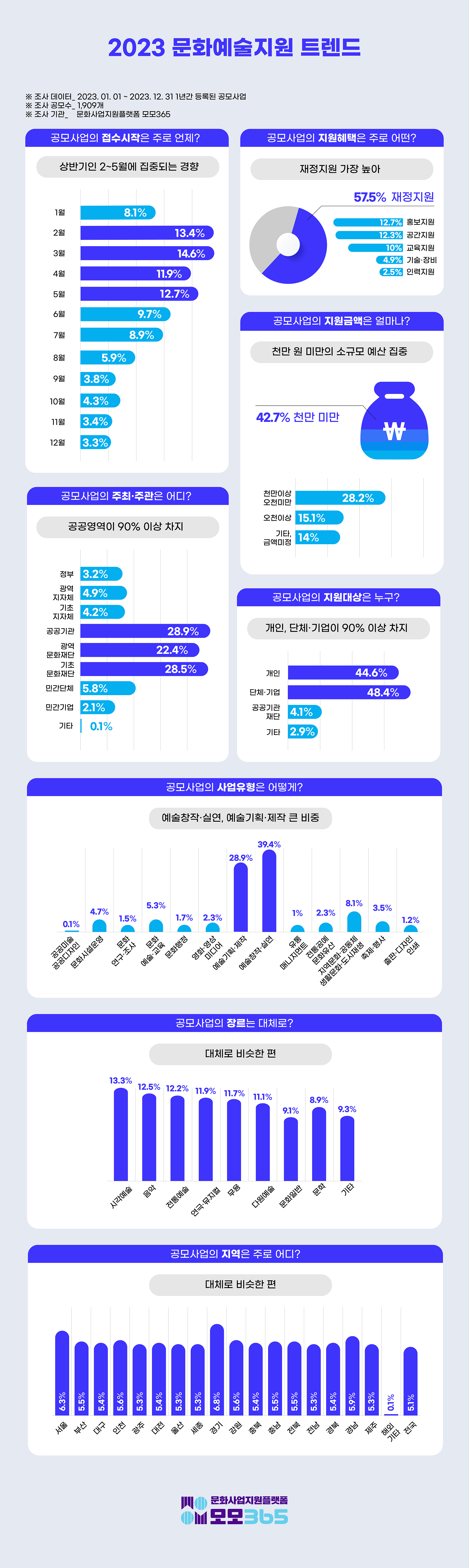 문화사업지원플랫폼 모모365에서 문화예술지원 트렌드를 발표했다. 업계 최초로 발표하는 이 트렌드 리포트는 2023년 모모365 플랫폼에 등록된 1,909개의 문화예술지원사업 데이터를 바탕으로 공모지원사업의 공모 시기와 지원 혜택, 사업유형별 분포는 어떠한지, 특정 분야나 장르에 편중되는지, 지원 대상과 지원 금액의 범위 등을 알아보기 위한 목적으로 조사되었다.