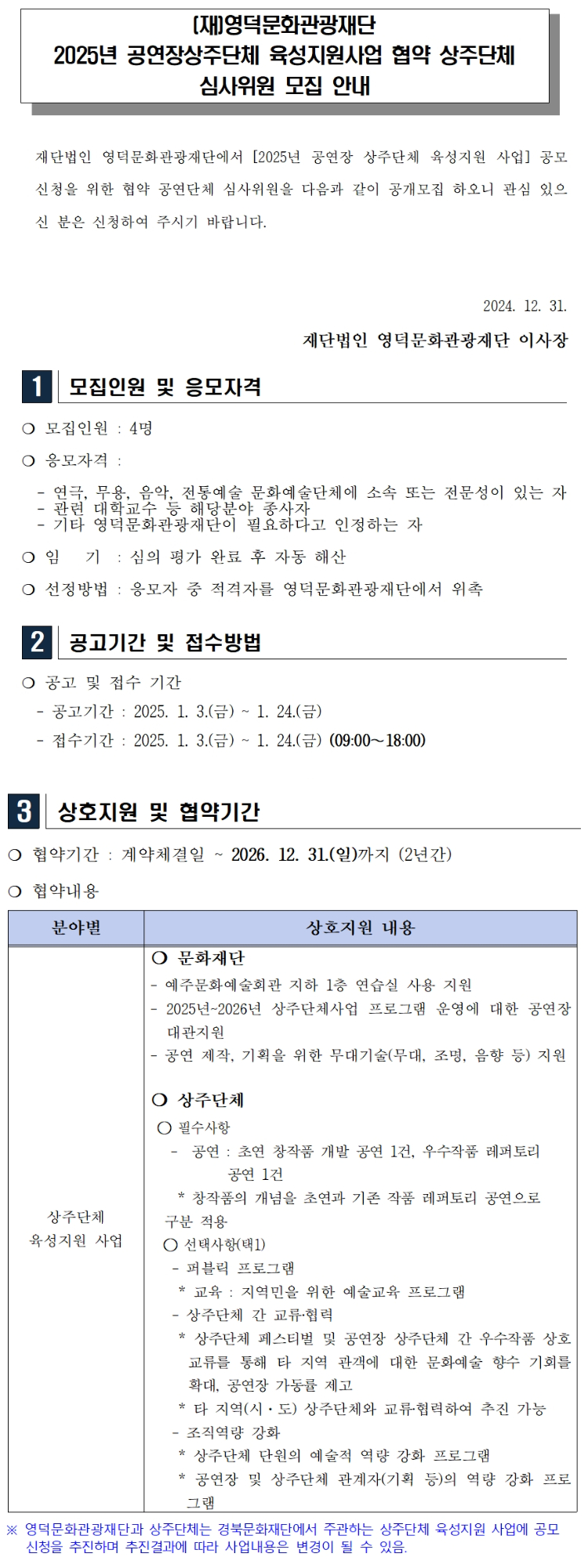 (재)영덕문화관광재단 2025년 공연장 상주단체 모집 공고 (~ 25. 1. 22.)