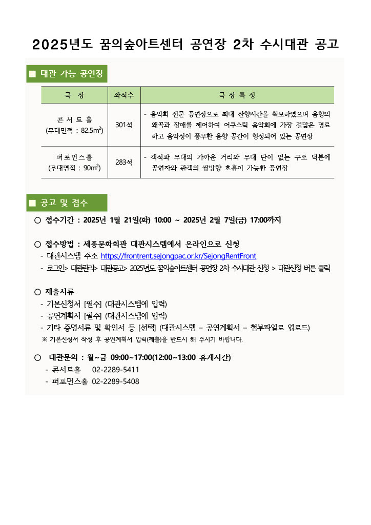 2025년도 <세종문화회관 꿈의숲아트센터> 공연장 2차 수시대관 공고