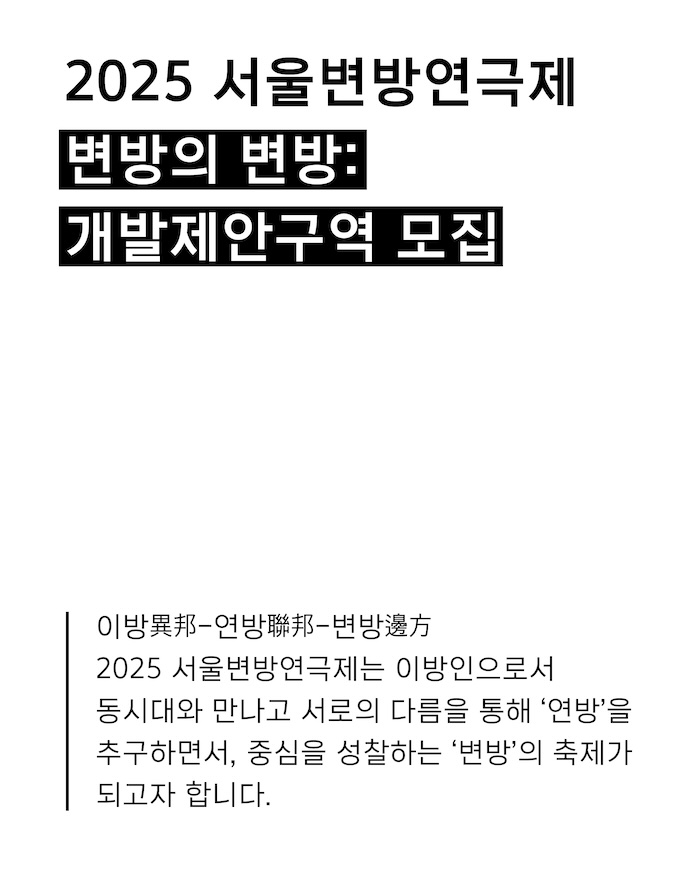 2025 서울변방연극제는 이방인으로서 동시대와 만나고 서로의 다름을 통해 ‘연방’을 추구하면서, 중심을 성찰하는 ‘변방’의 축제가 되고자 합니다.