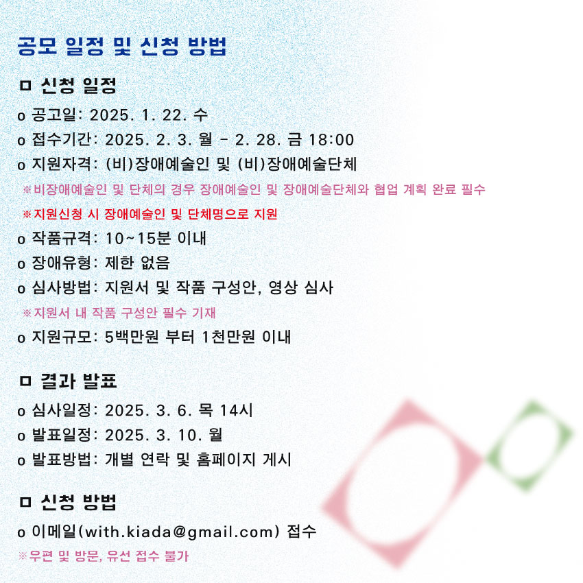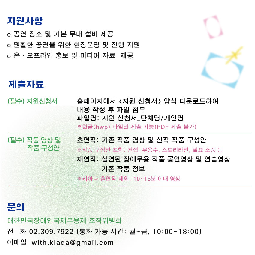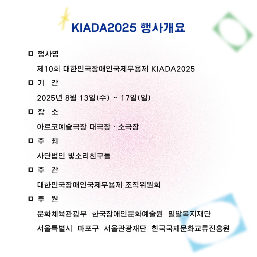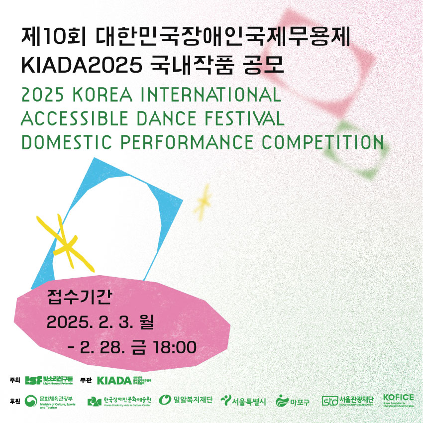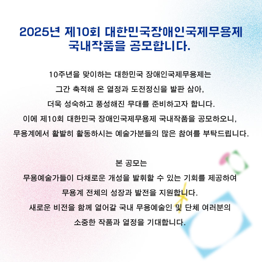 2025년 제10회 대한민국장애인국제무용제 국내작품을 공모합니다. 10주년을 맞이하는 대한민국장애인국제무용제는 그간 온 열정과 도전정신을 발판 삼아, 더욱 성숙하고 풍성해진 무대를 준비하고자 합니다. 이에 제10회 대한민국장애인국제무용제 국내작품을 공모하오니, 무용계에서 활발히 활동하시는 예술가분들의 많은 참여 부탁드립니다.