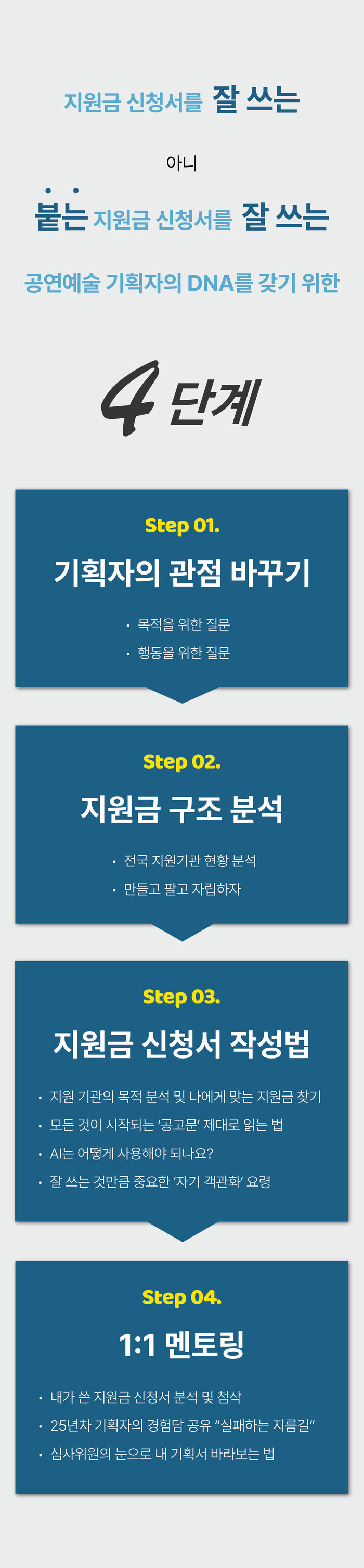 '붙는' 지원금 신청서를 잘 쓰는 공연예술 기획자의 DNA를 갖게 되는 4단계를 배웁니다. 지원금 신청서를 바라보는 관점부터 바꾸면 어떤 지원금 신청서 앞에서도 겁먹지 않는 능력을 갖게 될 거에요. 선착순 2명에게는 1:1 멘토링을 해 드립니다.