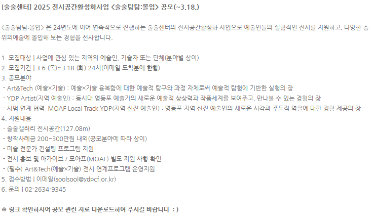 [영등포문화재단 술술센터] 2025 전시공간활성화사업 <술술탐탐:몰입> 공모(~3.18.)