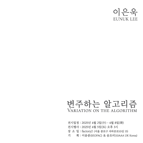 2017년 서울 세운상가에서 출발한 SEOFAC(대표:이윤종)과 2014년 영국에서 시작한 10AAA_UK_Kea두 단체는 해외 활동을 위한 창작가들의 프로젝트을 진행한다. 2019년 런던 올드 폴리스 스테이션 전시를 시작으로 이은욱 작가의 알고리즘 드로잉 시리즈를 주목하여 지난해 대구 아트스페이스펄에서 많은 주목을 받았던 이은욱 작가의 신작과 초기 알고리즘 드로잉 작품을 함께 만날 수 있는 전시를 2002년 설립이래 다양한 실험적인 현대미술 프로젝트를 실현하고 작가들을 발굴한 서울 facty2에서 진행한다.