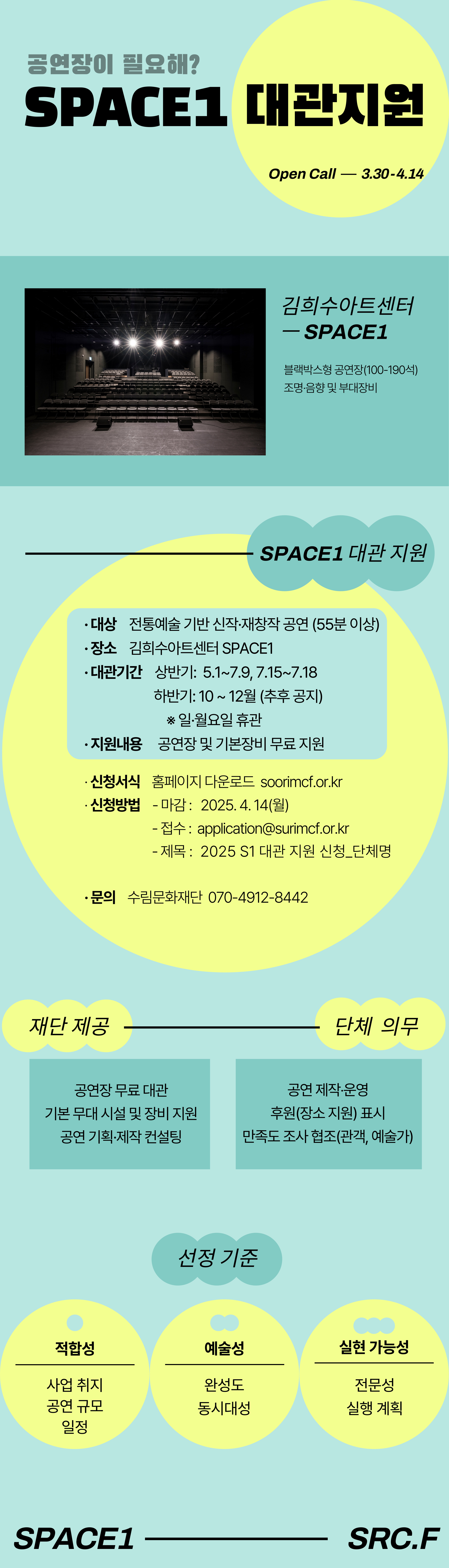 · 상세내용 및 신청서식 홈페이지 다운로드 www.soimcf..kr · 신청방법 - 마감 : 2025. 4. 14(월) - 접수 : application@surimcf..kr - 제목 : 2025 S1 대관 지원 신청_단체명