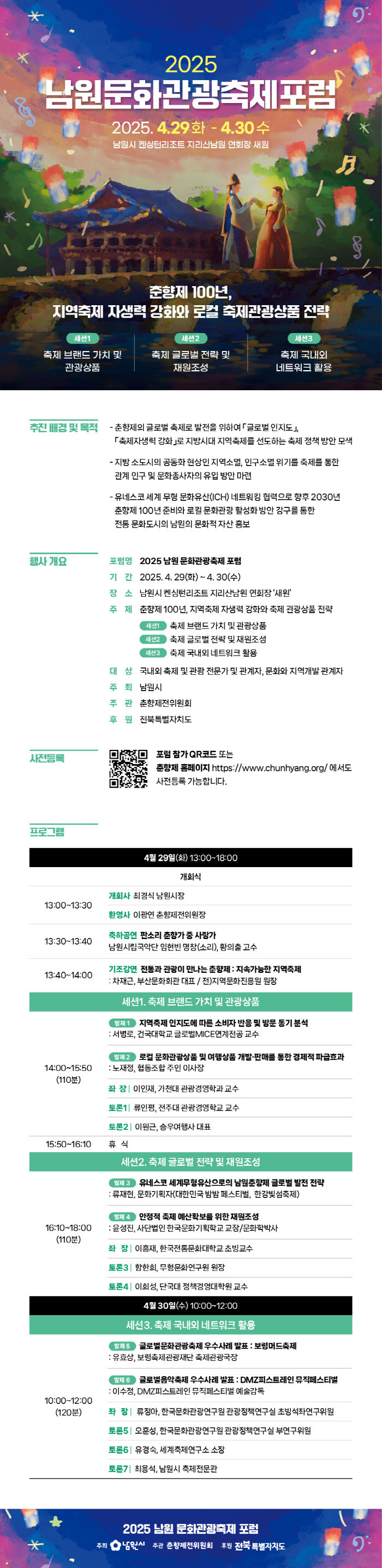 - 일시 : 2025. 4. 29(화)~30(수) - 장소 : 남원시 켄싱턴리조트 지리산남원 연회장 '새원' - 주제 : 춘향제 100년, 지역축제 자생력 강화와 축제 관광상품 전략 세션1_ 축제 브랜드 가치 및 관광상품 세션2_ 축제 글로벌 전략 및 재원조성 세션3_ 축제 국내외 네트워크 활용 - 대상 : 축제와 관광으로 지역을 고민하는 관계자 및 전문가 - 사전등록 : 무료 https://fms.gle/ztMEupQwqrgd1yJk9