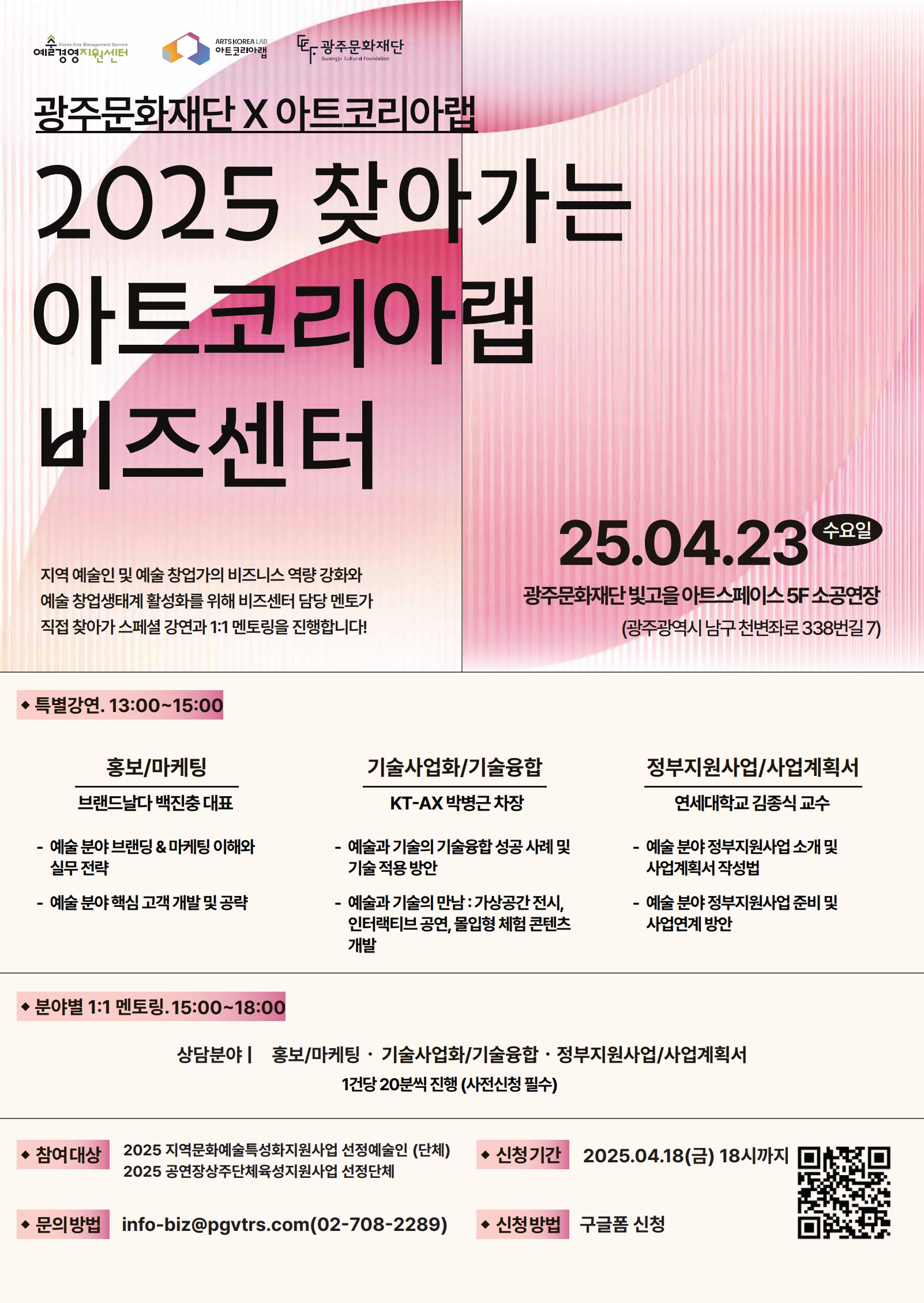 예술경영센터 아트코리아랩(“찾아가는 비즈센터”)과 광주문화재단이 협력하여, 2025년도 예술인 대상 역량강화 교육프로그램을 진행합니다. 최근 가장 많이 이슈화되고 있는 내용으로 전문 강사진을 모시고, 특별강연 뿐만 아니라, 예술기업의 성장과 창업에 관한 내용 등 맞춤형 1:1컨설팅도 알차게 진행되오니, 지역 예술인 분들의 많은 참여를 기다립니다.