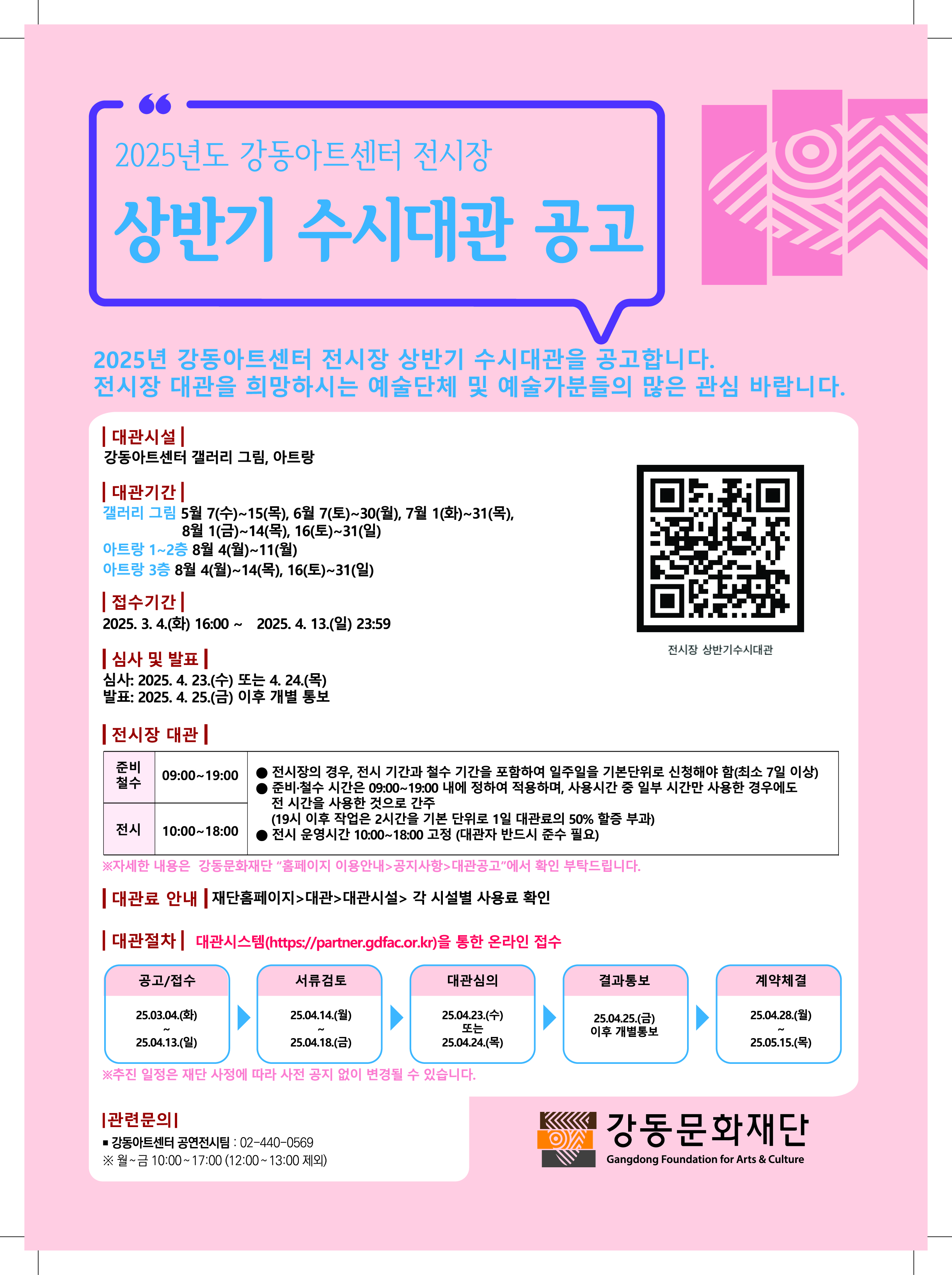<2025년도 강동아트센터 전시장 상반기 수시대관 공고> 2025년 강동아트센터 전시장 상반기 수시대관 신청을 받습니다. 전시장 대관을 희망하시는 예술단체 및 예술가분들의 많은 관심 바랍니다. ▷ 접수기간: 2025. 3. 4.(화) 16:00 ~ 4. 13.(일) 23:59 ▶ 접수방법: 강동아트센터 대관시스템(https://partner.gdfac..kr)을 통한 온라인 접수 ※ 강동아트센터 대관시스템에서 대관회원 가입 후 접수 가능 ▷ 대관시설: 강동아트센터 갤러리 그림, 아트랑 ▷ 대관기간: [갤러리 그림] 5월 7(수)~15(목), 6월 7(토)~30(월), 7월 1(화)~31(목), 8월 1(금)~14(목), 16(토)~31(일) [아트랑 1~2층] 8월 4(월)~11(월), 16(토)~31(일) [아트랑 3층] 8월 4(월)~14(목), 16(토)~31(일) ▷ 심사 및 발표: 심사-4. 23.(수) 또는 4. 24.(목)/ 발표- 4. 25.(금) 이후 개별통보 ▶ 자세한 내용은 강동문화재단 “홈페이지 이용안내>공지사항>대관공고”에서 확인 ▶ 바로가기: https://www.gdfac..kr/community/ko/notice/99681?q=NTNmNTJhNjlmNjk3NDViNmEzYmE0MzZkYTk0NjYzYzc3d