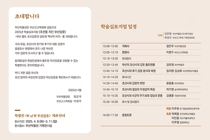 ○ 부산박물관 부산고고학회 공동학술심포지엄 <조선을 지킨 부산 갑옷> - 일 시: 4월 19일 오후 1시 - 장 소: 부산박물관 대강당 - 대 상: 누구나 - 신 청: 당일 현장 접수, 무료