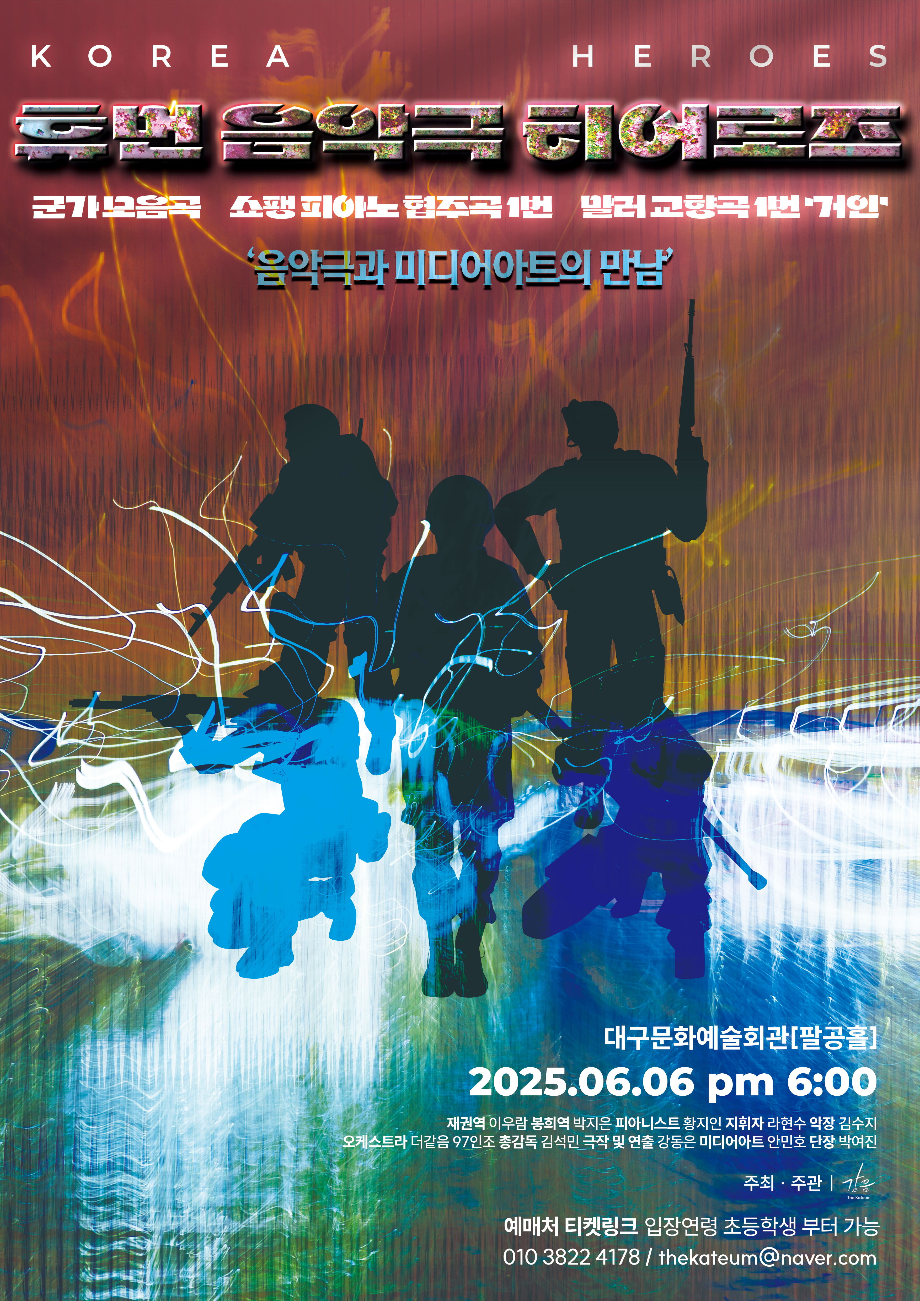 🎻 프로그램 구성 🎖 군가 모음곡 전선을 간다 · 멸공의 햇불 · 진짜사나이 · 팔도사나이 · 멋진사나이 · 최후의5분 🎹 쇼팽 피아노 협주곡 1번 (협연: 황지인) 🎼 말러 교향곡 1번 (전악장 · 97인조 오케스트라) 🎭 미디어 아트 & 연극 구성 (6.25 참전 영웅 실화 기반)