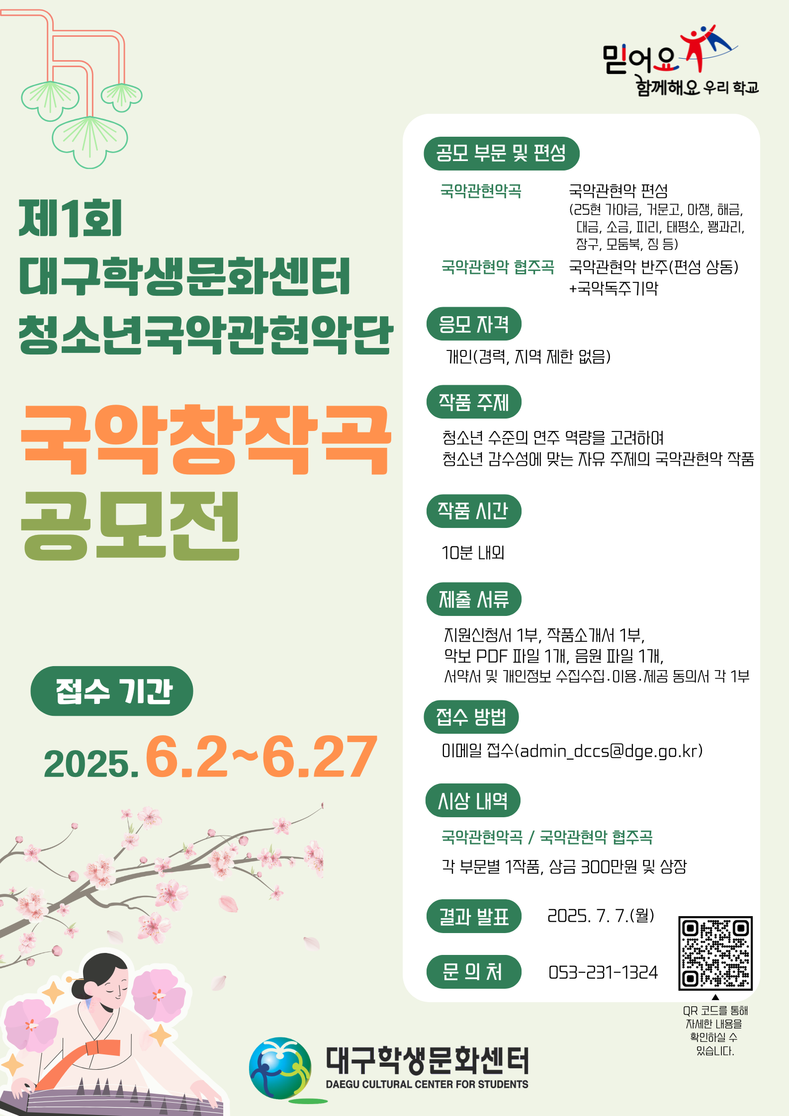 ○ (응모자격) 개인(※경력, 지역 제한 없음) ○ (공모부문) 국악관현악곡, 국악관현악 협주곡 ○ (출품기준) 1인 1곡 제출 ○ (작품 주제 및 내용) 청소년 수준의 연주 역량을 고려하여 청소년 감수성에 맞는 자유 주제의 국악관현악 작품 ○ (작품 시간) 10분 내외 ○ (접수기간) 2025. 6. 2.(월) ~ 6. 27.(금) 18:00까지 ○ (제출방법) 이메일 접수(admin_dccs@dge.go.kr) ○ (제출서류) 지원신청서 1부, 작품소개서 1부, 악보 PDF 파일 1개, 음원 파일(미디 음원 가능) 1개, 서약서 및 개인정보 수집․이용․제공 동의서 각 1부 ○ (시상 내역) 국악관현악곡/국악관현악 협주곡 각 부문별 1작품, 상금 300만원 및 상장 ○ (결과발표) 2025. 7. 7.(월) 10:00, 대구학생문화센터 홈페이지 ○ (문의처) 053-231-1324