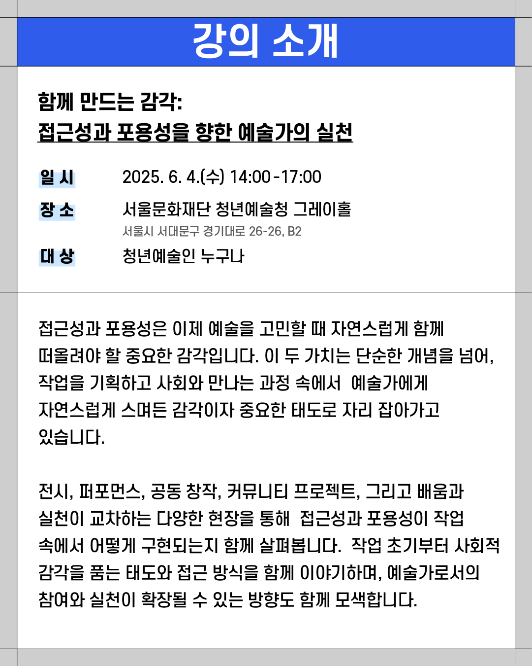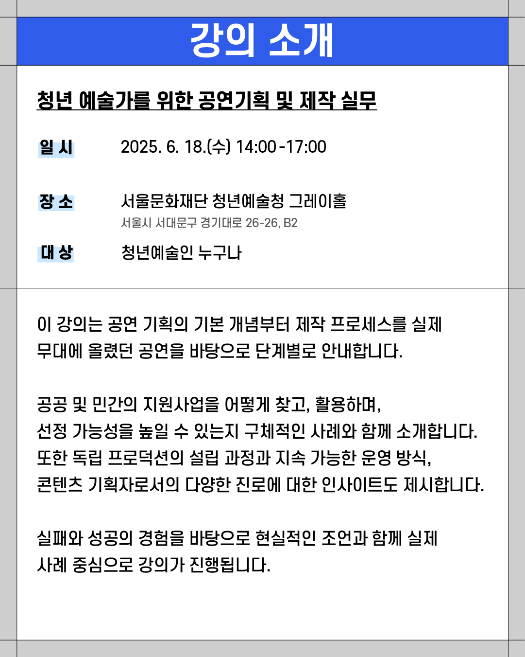 📣 예술을 전공했지만, 앞으로의 작업이 막막한가요?대학에서 배우지 못한 현장 실무,어떻게 대처해야 할까요?그래서 청년예술청이 준비했습니다.예술 현장의 실무 지식과 생생한 경험을 나누는 특별한 만남,