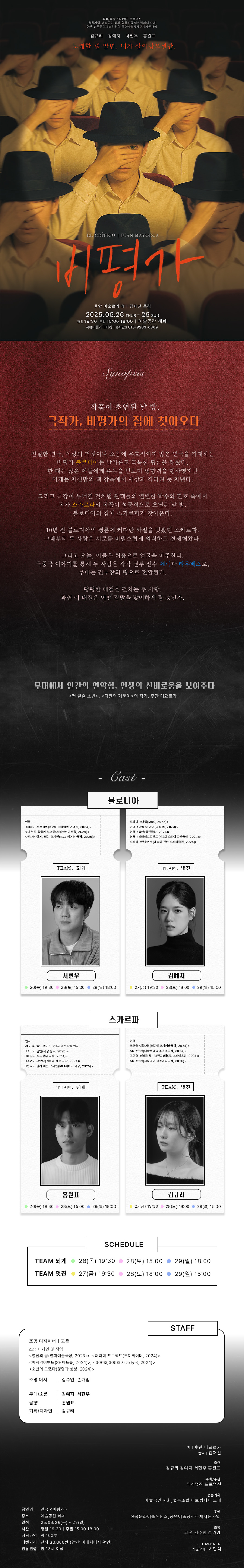 되게멋진 프로덕션 연극 <비평가> 공연기간 2025.06.26.(목)~06.29.(일) 공연시간 평일 19:30 / 주말 15:00, 18:00 공연장소 예술공간 혜화 관람연령 만 13세 이상 관람가 티켓예매 플레이티켓 https://www.playticket.co.kr/nav/detail.html?idx=3630 공연문의 010-9283-0869