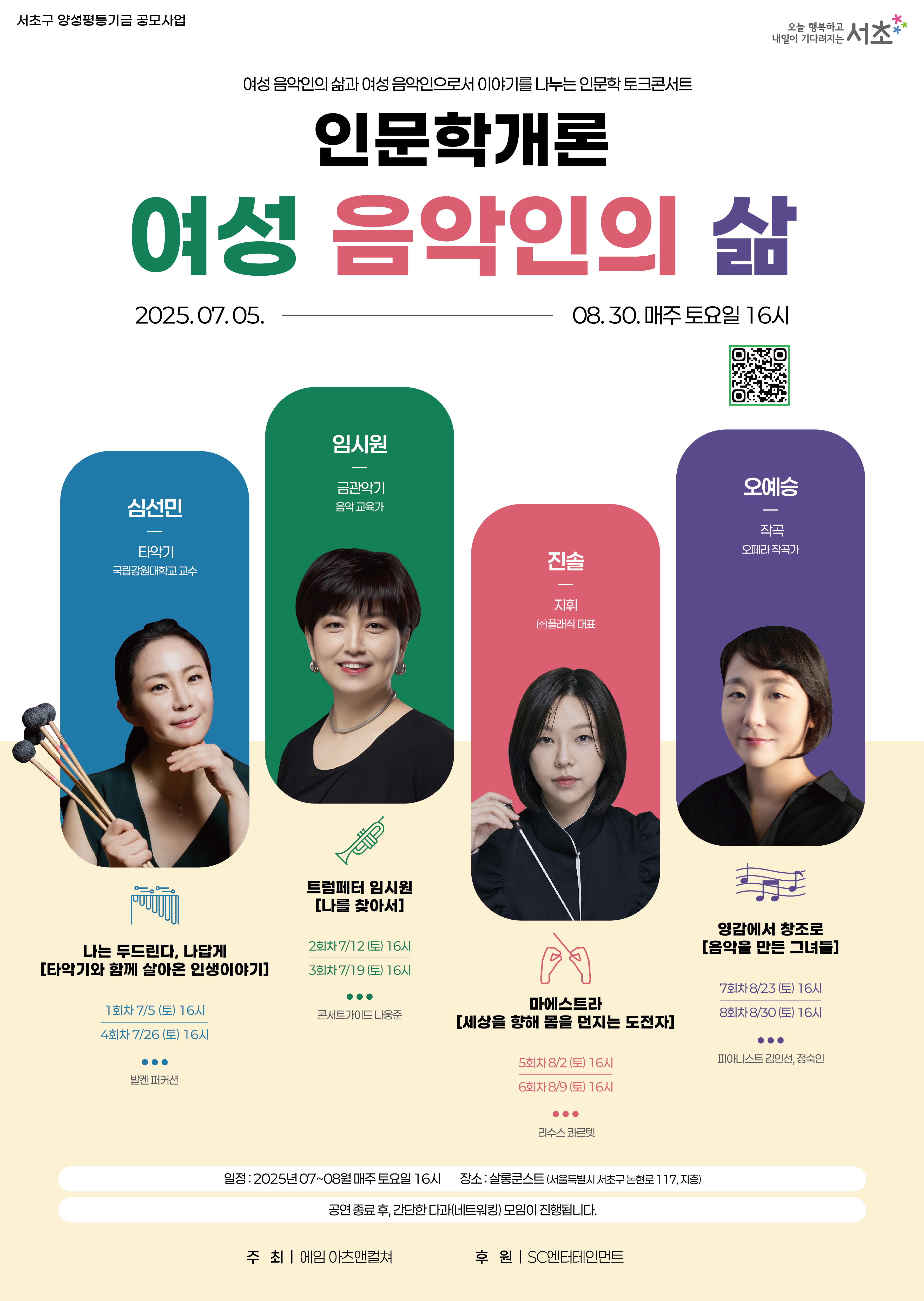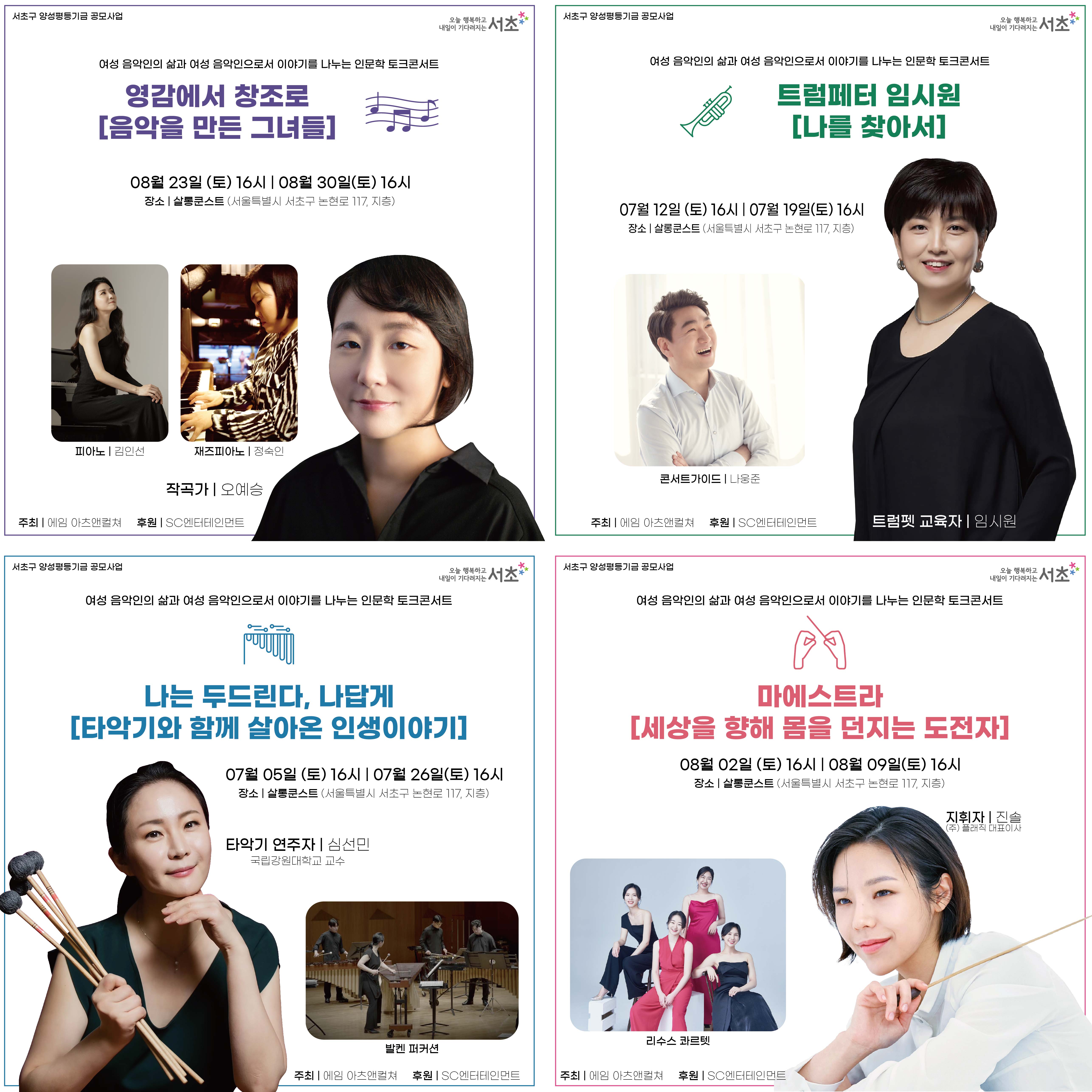 서초구청과 함께하는 인문학 토크콘서트가 07월 05일(토)부터 08월 30일(토)까지 진행됩니다. 지휘자 진솔, 작곡가 오예승, 퍼커셔니스트 심선민, 트럼페터 임시원 네 명의 여성음악인들의 진솔한 이야기, 과거와 현재 여성음악인으로 살아가고 있는 여성들에 대한 이야기를 들어보시길 바랍니다.