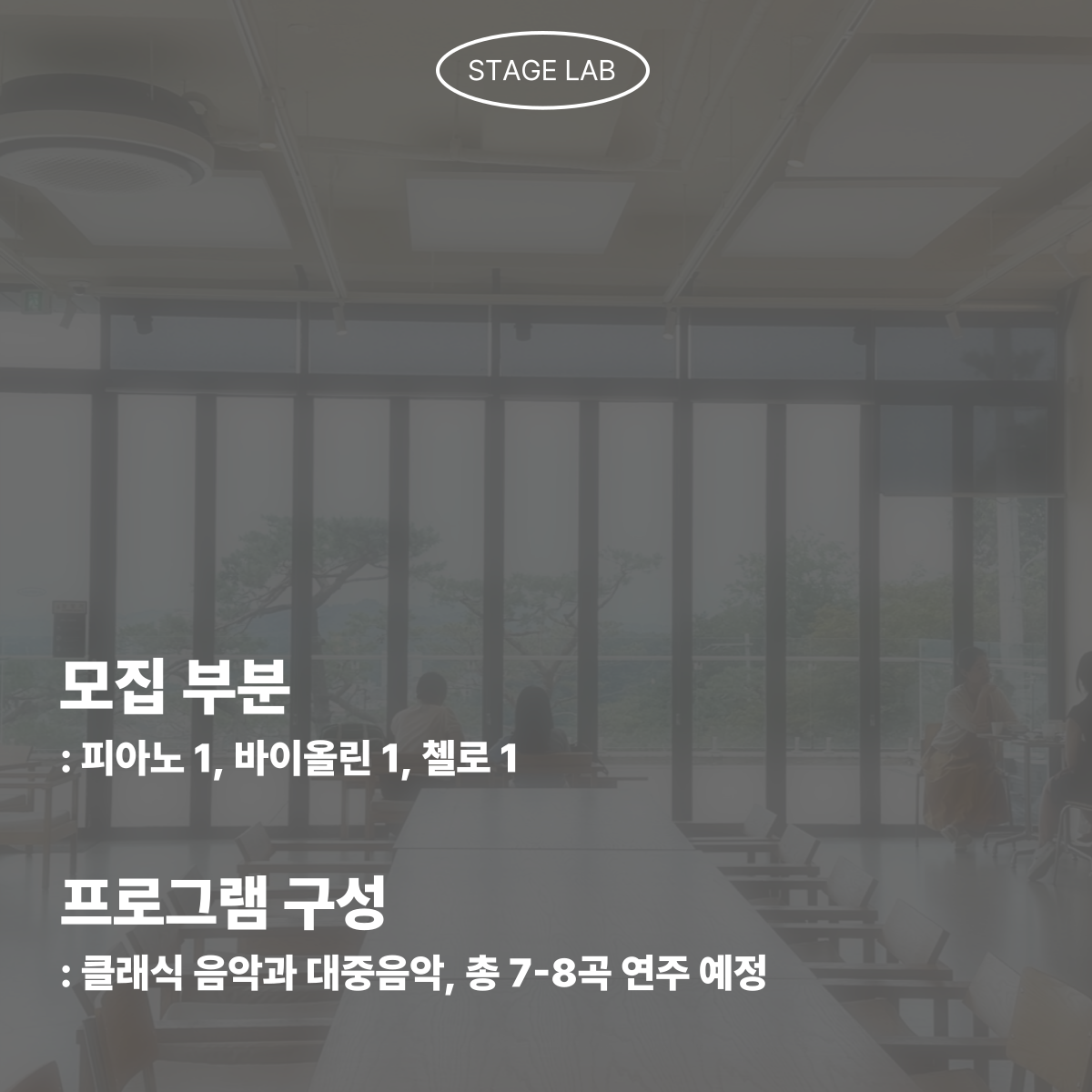 안녕하세요. 예술기획단체 '스테이지랩'입니다 :) 저희는 공연기획자를 꿈꾸는 청년들이 모여 직접 공연을 만들어가는 프로젝트형 팀으로, 오는 8월 2일에 진행할 클래식 공연에 연주자를 모집하고자 합니다. 같이 첨부해드린 사진을 참고하여 많은 지원과 관심 부탁드립니다. 감사합니다.