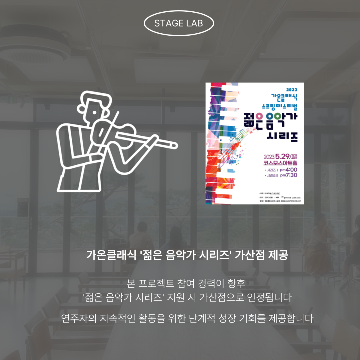 ✨ 활동혜택 - 프로필에 기재 가능한 공식 연주 활동 - 가온클래식 명의 수료증 발급 - 지역문화 기반 공연 프로젝트 참여 경험 - 연습실 무료 지원 - 가온클래식 '젊은 음악가 시리즈' 가산점 제공