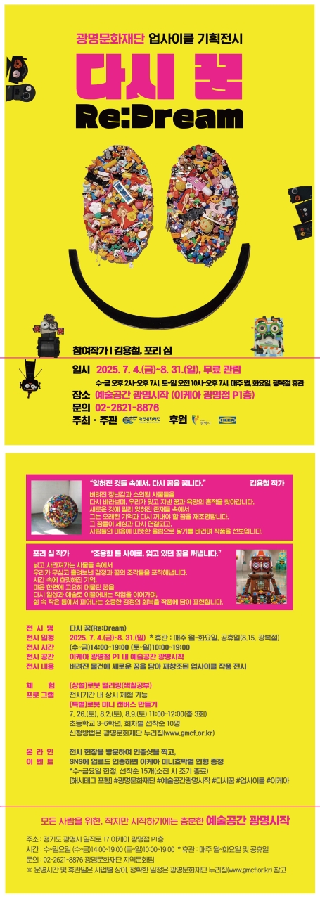 1. 전시명: 2025년 예술공간 광명시작 업사이클 기획전시 <다시 꿈(Re:Dream)> 2. 전시일정: 2025. 7. 4.(금)~8. 31.(일) * 휴관: 매주 월~화요일, 공휴일(8. 15. 광복절) 3. 전시시간: 평일(수~금): 14:00~19:00, 주말(토~일): 10:00~19:00 4. 전시공간: 예술공간 광명시작(경기도 광명시 일직로 17, 이케아 광명점 P1층) 5. 전시내용: 버려진 물건에 새로운 꿈을 담아 재창조된 업사이클 작품 전시 6. 관람료: 무료 7. 프로그램: (상설)로봇 컬러링(색칠공부) (특별)로봇 미니 캔버스 만들기(초등학교 3~6학년, 총 3회~회차별 선착순 10명)
