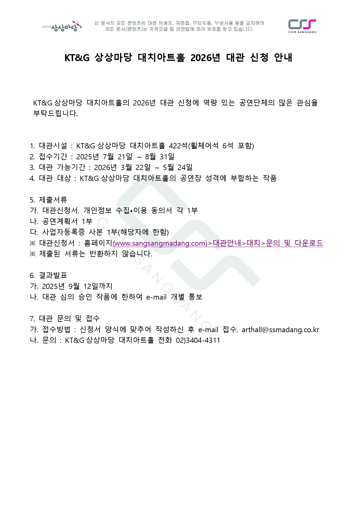[대관안내] KT&G 상상마당 대치아트홀 2026년 대관 신청 안내