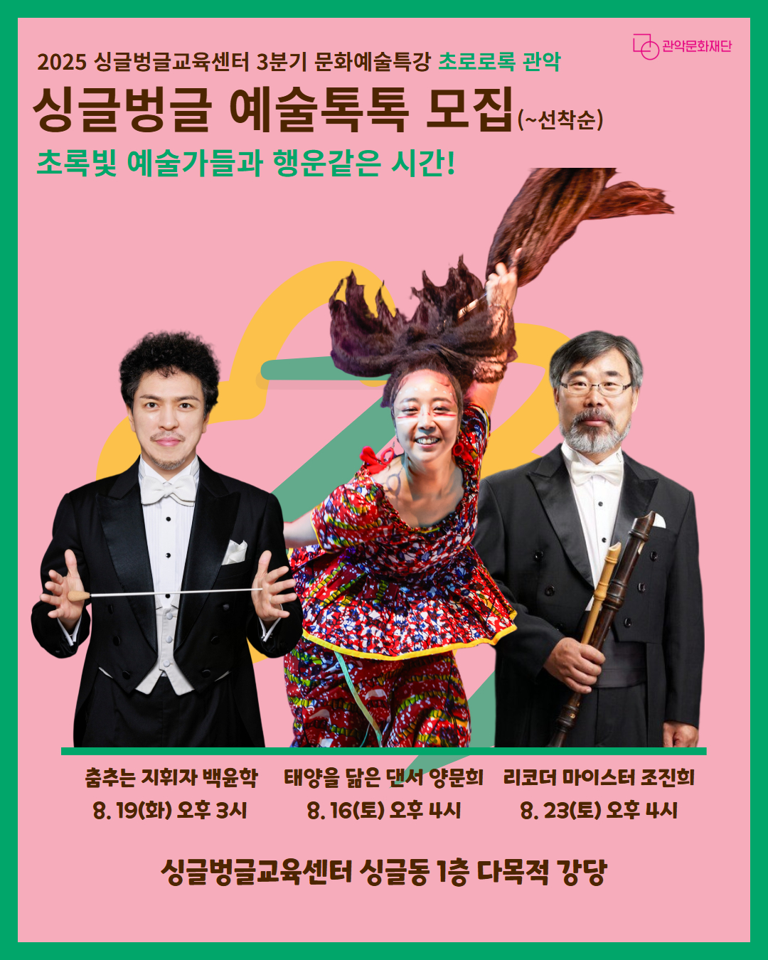 🌱 2025년 3분기 평생학습 문화예술 특강 ‘초로로록 관악’ <8월의 싱글벙글 예술톡톡 모집임박!> ~ 강좌별 개강일전까지!