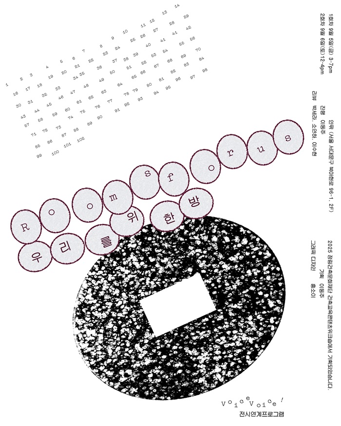 - 전시연계프로그램 정보 - <우리를 위한 방 Rooms f us> 안팎(서울 서대문구 북아현로 96-1 2층) 1회차: 2025.9.5 (금) 오후3-7시 2회차: 2025.9.6 (토) 오후12-4시 참가비: 1회당 3만5천원 참여신청: https://event-us.kr/voicevoice/event/109782
