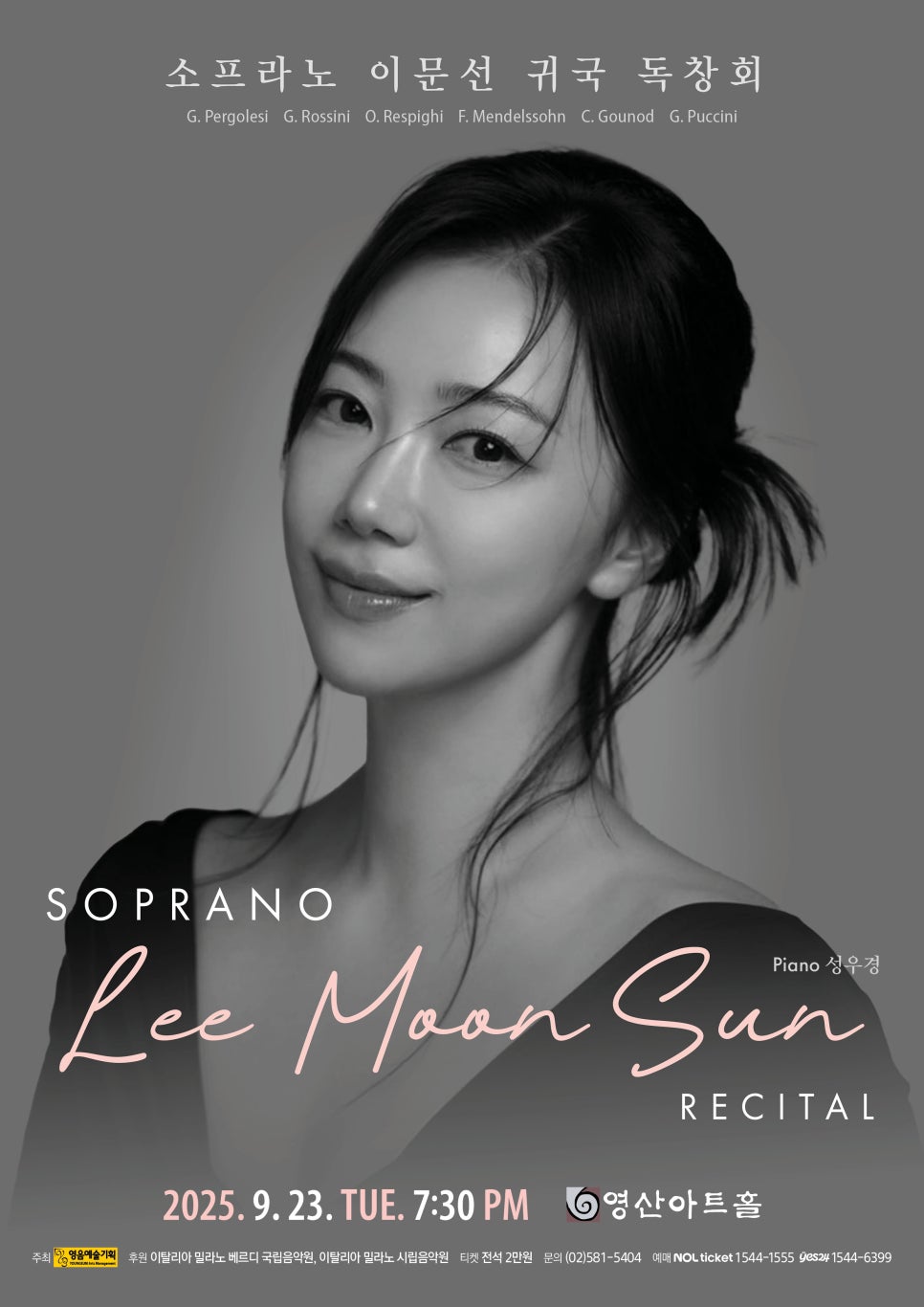 화려하고 따뜻한 음색과 풍부한 표현력으로 청중들의 마음을 울리는 소프라노 이문선은 이탈리아 밀라노 베르디 국립음악원 Canto Biennio 최고연주자과정, 이탈리아 밀라노 시립음악원 보컬 코치 과정, 이탈리아 밀라노 G. Donizetti 아카데미 보컬 코치 과정을 졸업한 후 이탈리아 밀라노 Mariano Comense 아카데미 합창지휘 과정을 우수한 성적으로 졸업하였다.