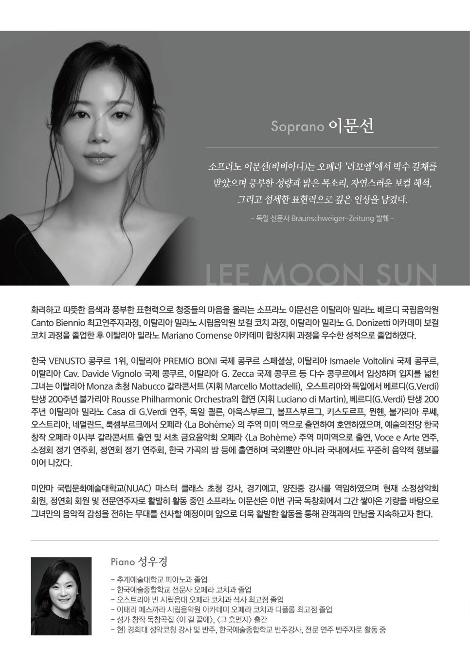 미얀마 국립문화예술대학교(NUAC) 마스터 클래스 초청 강사, 경기예고, 양진중 강사를 역임하였으며 현재 소정성악회 회원, 정연회 회원 및 전문연주자로 활발히 활동 중인 소프라노 이문선은 이번 귀국 독창회에서 그간 쌓아온 기량을 바탕으로 그녀만의 음악적 감성을 전하는 무대를 선사할 예정이며 앞으로 더욱 활발한 활동을 통해 관객과의 만남을 지속하고자 한다.