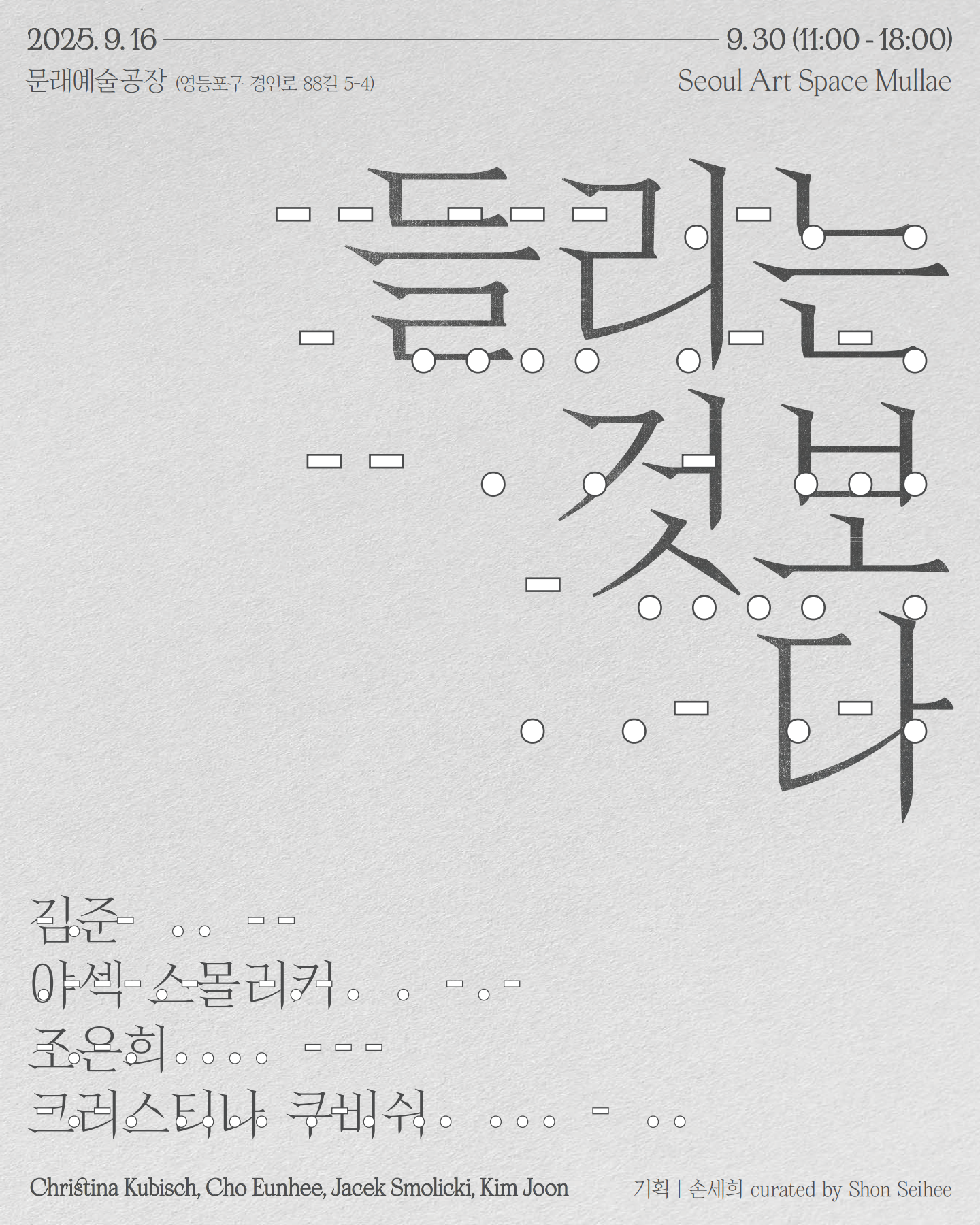 🎧참여작가: 김준, 야섹 스몰리키, 조은희, 크리스티나 쿠비쉬 ▪️큐레이터: 손세희 ▫️어시스턴트큐레이터: 박상은, 이현화