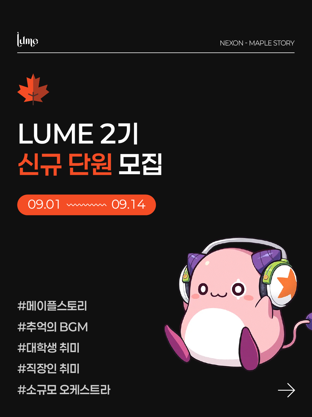 지난 7월 창단연주회를 성공적으로 마친 LUME에서, 이번 기수에서는 메이플스토리 BGM을 비롯해 K-pop 메들리, 크리스마스 메들리를 직접 연주하며 즐거움과 의미를 동시에 나누고자 합니다.