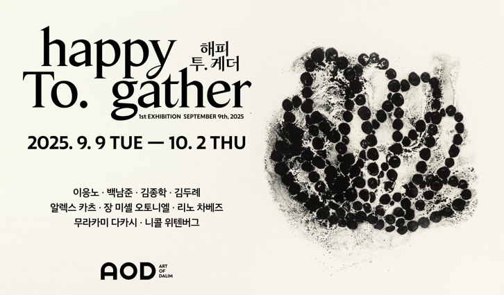 HAPPY To.gather AOD(Art Of Dalim) 뮤지엄은 9월 9일(화)부터 10월 2일(목)까지 소장품전 <HAPPY To.gather>를 개최합니다. 이번 전시는 일상 속에서 발견되는 작은 기쁨과 따뜻한 위로의 순간을 관람객과 함께 나누고자 마련되었습니다. 2019년부터 홍대 앞에서 시작된 Third Museum은 올해 AOD(Art Of Dalim)라는 새로운 이름과 공간으로 재단장하여 다시 관람객을 맞이합니다. 변화된 공간에서 선보이는 이번 전시에는 장 미셸 오토니엘(Jean-Michel Othoniel)을 비롯해 이응노, 리노 차베즈 (Lino Chávez) 등 다림문화재단이 소장한 국내외 작가 10여 명의 작품이 소개됩니다. 세련된 색채와 자유롭고 환상적인 상상력이 담긴 회화 작품들은 뮤지엄 전체를 밝고 새로운 빛으로 물들이며, 관람객에게 특별한 시간을 선사할 것입니다. <HAPPY To.gather>는 단순히 작품을 감상하는 자리를 넘어, 예술을 통해 서로의 마음을 잇고 일상에 작은 설렘과 휴식을 더하는 시간이 되기를 바랍니다. 전시정보 • 전시명: HAPPY To.gather • 참여작가: 장 미셸 오토니엘, 이응노, 김두례, 알렉스카츠, 리노차베즈, 김종학, 니콜 위텐버그, 백남준, 최선호 등 • 전시일자: 2025년 9월 9일(화) ~ 2025년 10월 2일(목) • 장소: 서울 마포구 잔다리로3길 4, AOD뮤지엄 • 휴관일 및 입장료: 월요일 휴관 / 입장료 무료