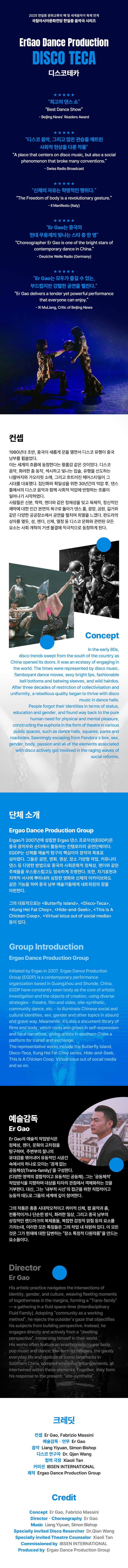 중국 광저우와 순더에서 활동하는 컨템포러리 공연단체 ‘Ergao Dance Production Group’의 공연으로 ‘디스코테카(DISCO TECA)’을 소개합니다. 디스코테카(DISCO TECA) 1980년대 초반, 중국이 새롭게 문을 열면서 디스코 유행이 중국 남부를 휩쓸면서 사회적 억압에 반항하는 흐름이 일어나기 시작하였다. 판도라의 상자를 열 듯, 성, 젠더, 신체, 열정 등 디스코 문화와 관련된 모든 요소는 사회 개혁의 거센 물결에 적극적으로 동참하게 된다. 일시/장소: 2025.9.21. (일) 14:00 / 예술극장 극장1 러닝타임: 70분 대상: 7세 이상 입장 가능(2018년 포함 이전 출생자) 가격: 전석 18,000원 예매: NOL 티켓 바로가기 https://tickets.interpark.com/goods/25012290 *국립아시아문화전당 한일중 음악극 시리즈 패키지 상품 2025-08-29(금) ~ 2025-09-12(금) 패키지는 공연을 예매할 수 있는 온라인 전용 공연예매권을 구매하는 것입니다. 날짜/좌석은 예매권으로 공연 예매시 지정하세요. 구매 전 사용방법과 유효기간을 꼭 확인하세요! 예매: NOL 티켓 바로가기 https://tickets.interpark.com/goods/25012557