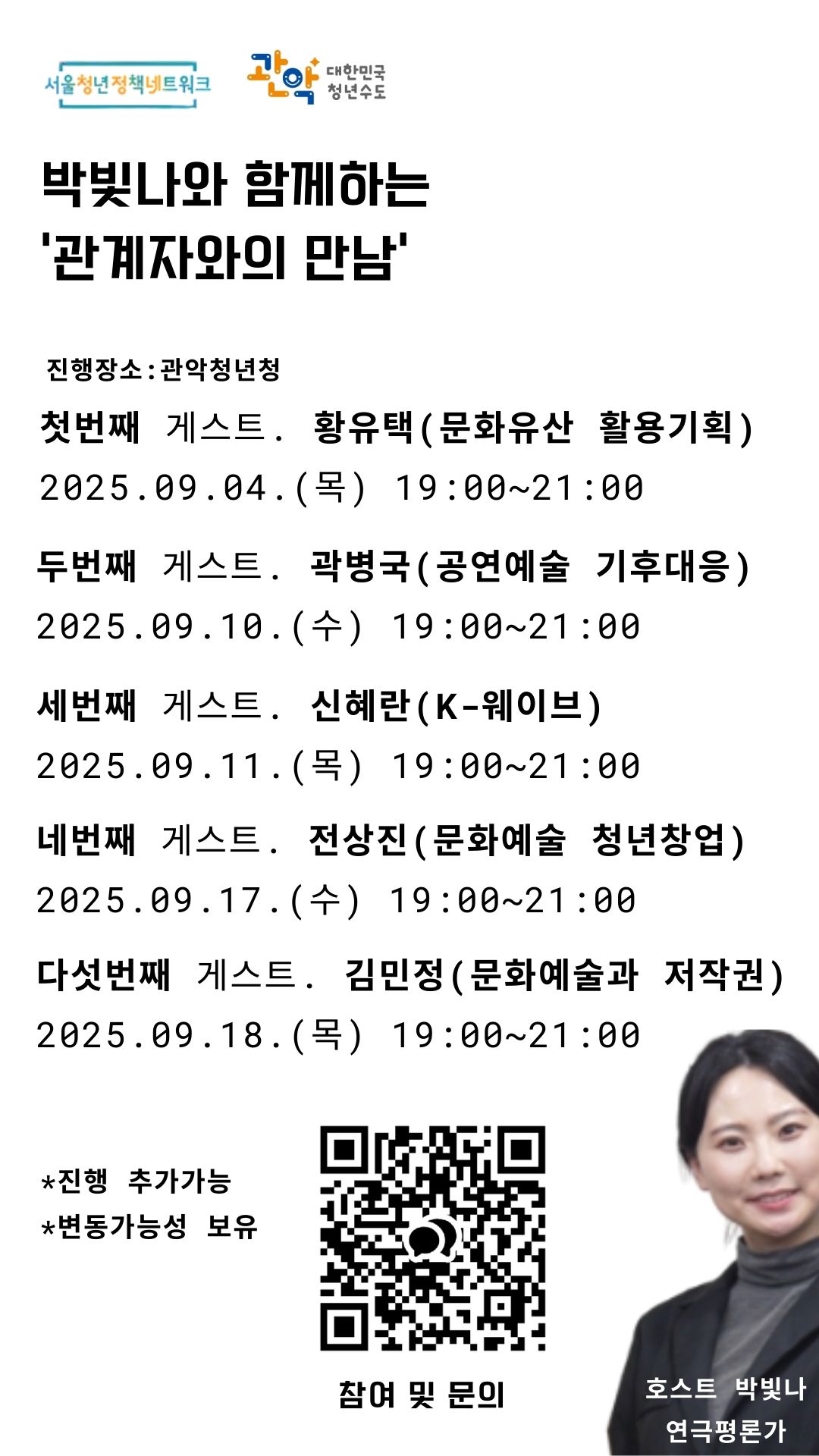 릴레이 토크행사 해당관련 신청 및 문의는 아래 카카오톡 링크(포스터 QR입장방과 동일)에서 확인하실 수 있습니다.