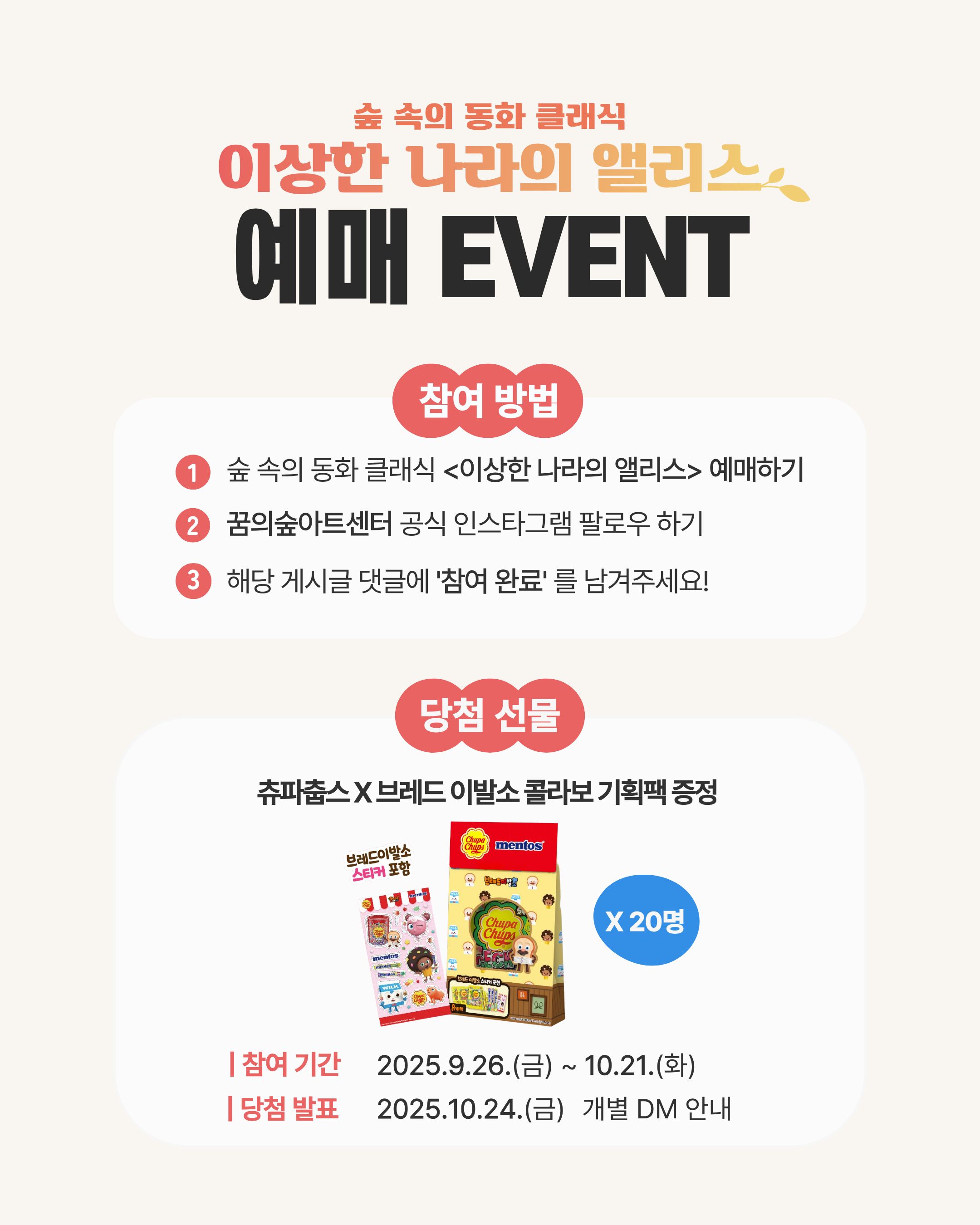 ✅ 참여 방법 ① 숲 속의 동화 클래식 <이상한 나라의 앨리스> 예매하기 ② 꿈의숲아트센터 공식 인스타그램 팔로우 하기 ③ 해당 게시글 댓글에 '참여 완료'를 남겨주세요! 이벤트에 참여하신 20분께 츄파츕스 선물세트를 드립니다 10월 26일 꿈의숲아트센터에서 만나요! 🙌🏻